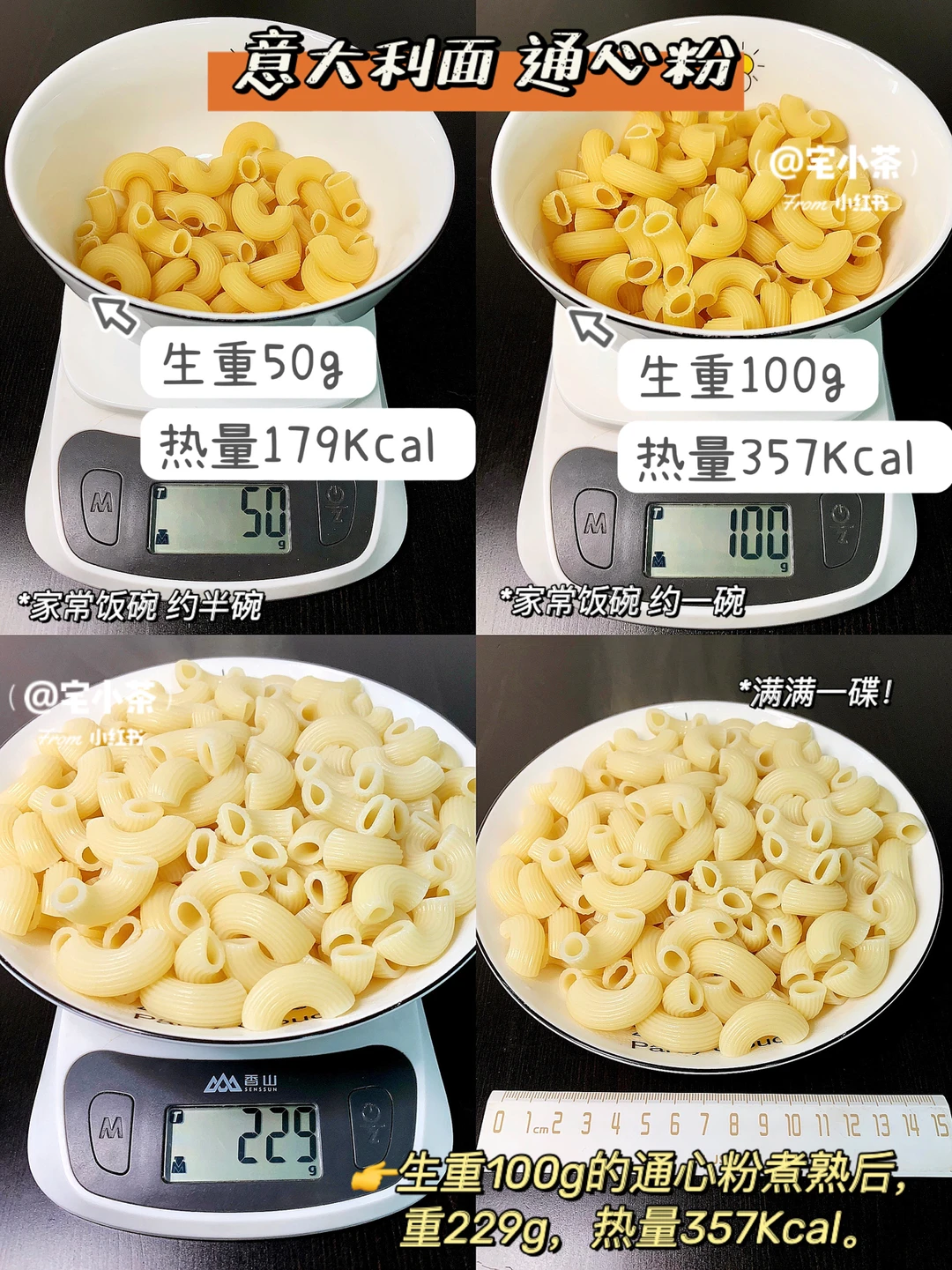 👉生重100g的通心粉煮熟后,重229g,热量357Kcal。