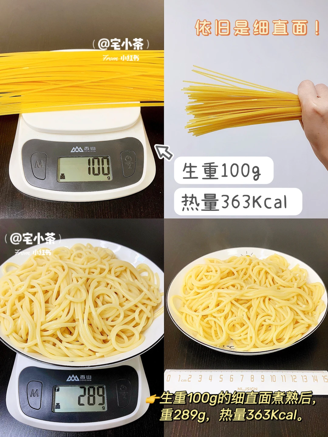 👉生重100g的细直面煮熟后,重289g,热量363Kcal。