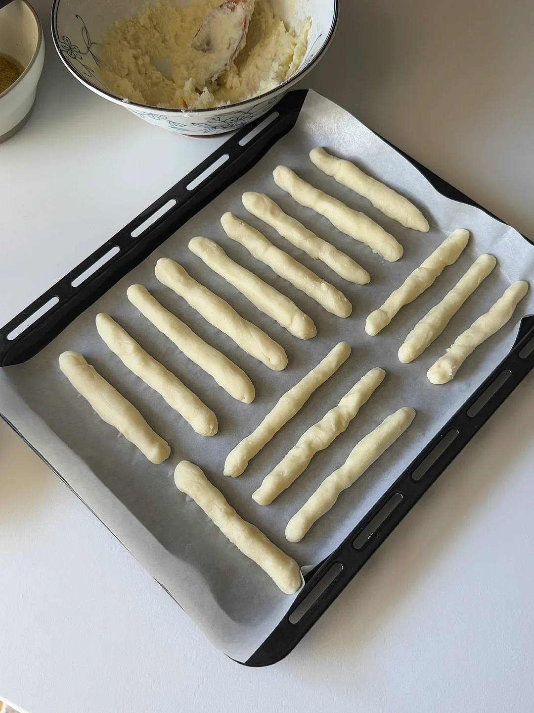 4️⃣长条状土豆淀粉泥放在油纸上,刷上拌好的油