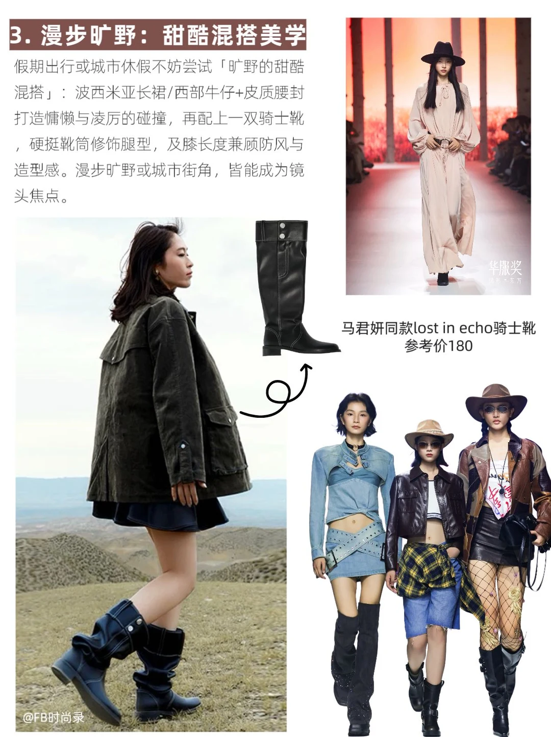 假期出行或城市休假不妨尝试「旷野的甜酷混搭」:波西米亚长裙/西部牛仔+皮质腰封打造慵懒与凌厉的碰撞,再配上一双骑士靴,硬挺靴筒修饰腿型,及膝长度兼顾防风与造型感。漫步旷野或城市街角,皆能成为镜头焦点。