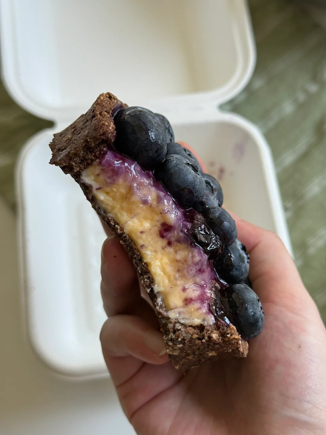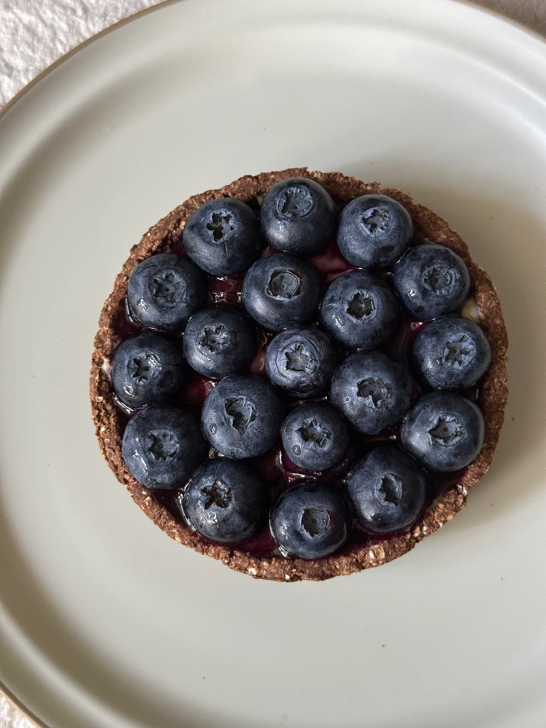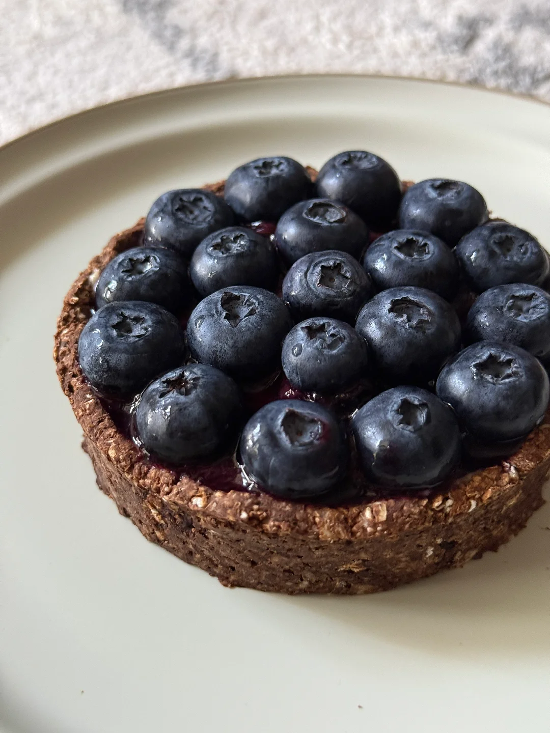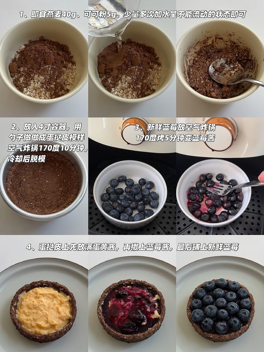 [向右R]食材:积食燕麦片40g、可可粉5g、牛奶120g、脱脂奶粉10g、玉米淀粉5g、零卡糖10g、蛋黄一颗、蓝莓些许