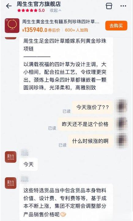 有网友发现,周生生天猫旗舰店里一件黄金生生有喜系列珍珠四叶草项链价格上调至136000元。从周生生天猫旗舰店客服获悉,这款项链此前一天售价120800元,一夜之间暴涨15200元;叠加店铺满3800减60的优惠活动,券后价135940元。同日,各大金饰品牌实时报价再次接近1400元/克。周生生足金饰品克价为1392元/克,比1月5日的1376元/克上涨16元/克。周大福、潮宏基、谢瑞麟报价均为1392元/克。(界面)