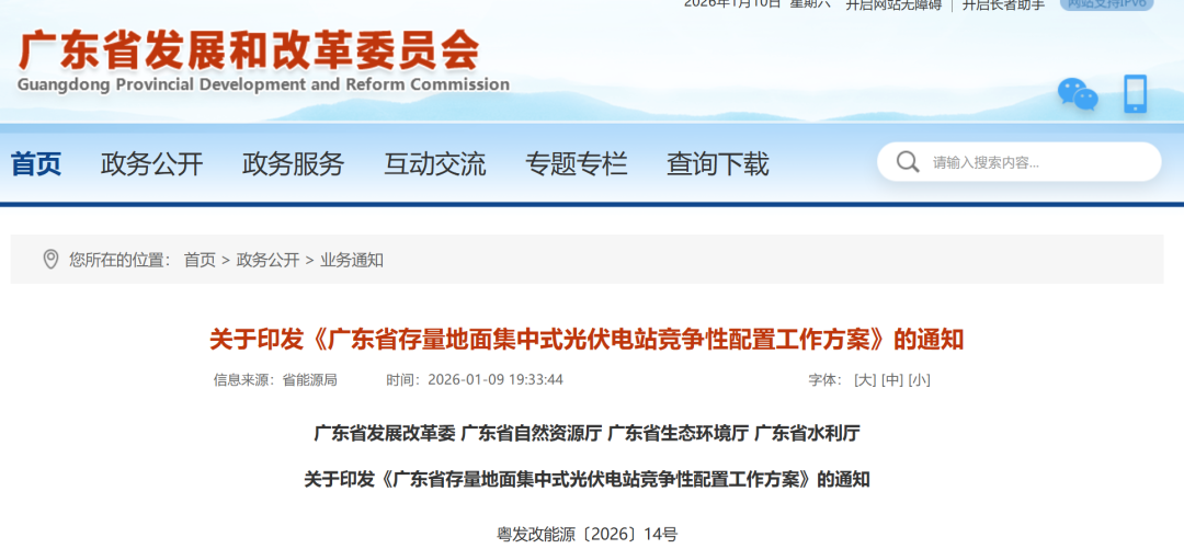 储能与电力市场获悉,1月9日,广东省发展改革委、广东省自然资源厅、广东省生态环境厅、广东省水利厅联合发布《广东省存量地面集中式光伏电站竞争性配置工作方案》(粤发改能源〔2026〕14号),以及《关于组织开展首批存量地面集中式光伏电站竞争性配置工作的通知》(粤发改能源函〔2026〕44号)。