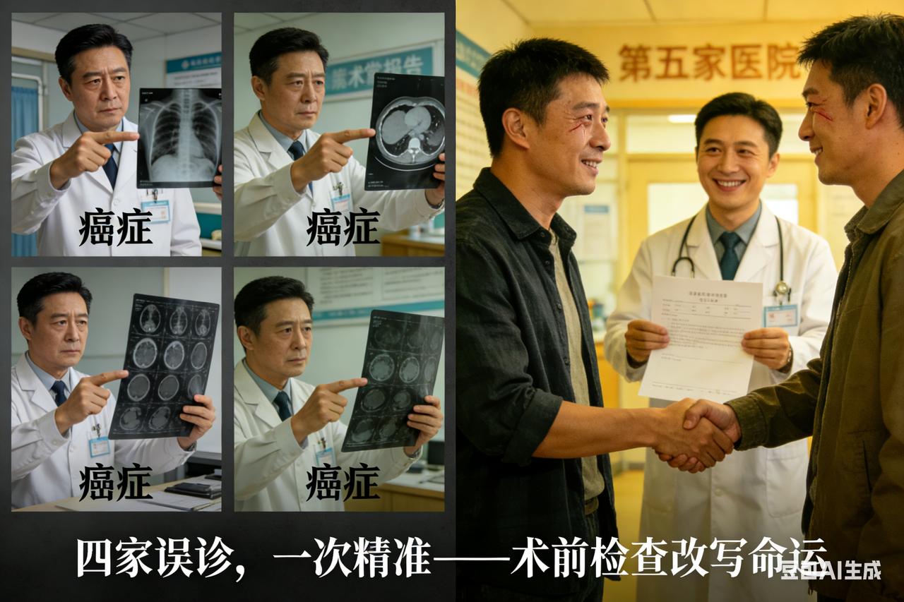 四家医院误诊癌症 男子术前检查躲过一劫 《误诊惊魂:东莞男子被4家医院判“死刑”,手术刀悬顶瞬间绝处逢生》 这不是剧本,而是一场让人冷汗直流的“生死豪赌”。东莞一男子因咳嗽就医,竟被4家三甲医院轮番下达“死亡通知书”——肺癌。 两年间,他背负着“绝症”的枷锁辗转多地。CT片上那枚19毫米的阴影,像一只狰狞的眼睛,被四位专家异口同声判定为“高危恶性肿瘤”。为了求生,他花光积蓄,甚至在手术同意书上按下了鲜红的手印。当他躺在推车上,被推向冰冷的手术室时,家属的哭声撕心裂肺,他望着无影灯,只剩下无尽的绝望。 就在主刀医生拿起手术刀,即将划开胸廓的致命一秒,一位实习医生盯着最新的增强CT片突然失声惊呼:“停下!肺里是干净的!那个结节不见了!” 手术室瞬间陷入死一般的寂静。原来,那所谓的“癌症”,不过是炎症消退后留下的一个“幽灵影子”。为了这个虚幻的癌,他差点失去健康的肺叶!回顾那一刻,他至今后怕得浑身发抖:“如果刀落下来,切掉的就是我自己的肉,我的人生就彻底毁了!” 从“癌症患者”到“健康人”,只隔着一张CT片的距离。这起发生在身边的真实荒诞剧,比恐怖片更令人窒息:在生死攸关的诊断面前,医生的一支笔,真的能定生死。
