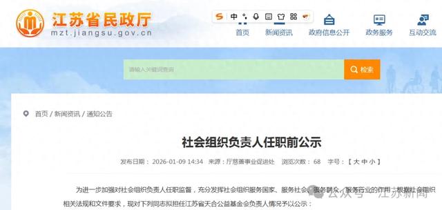 1月9日,江苏省民政厅发布一则社会组织负责人任职前公示。
