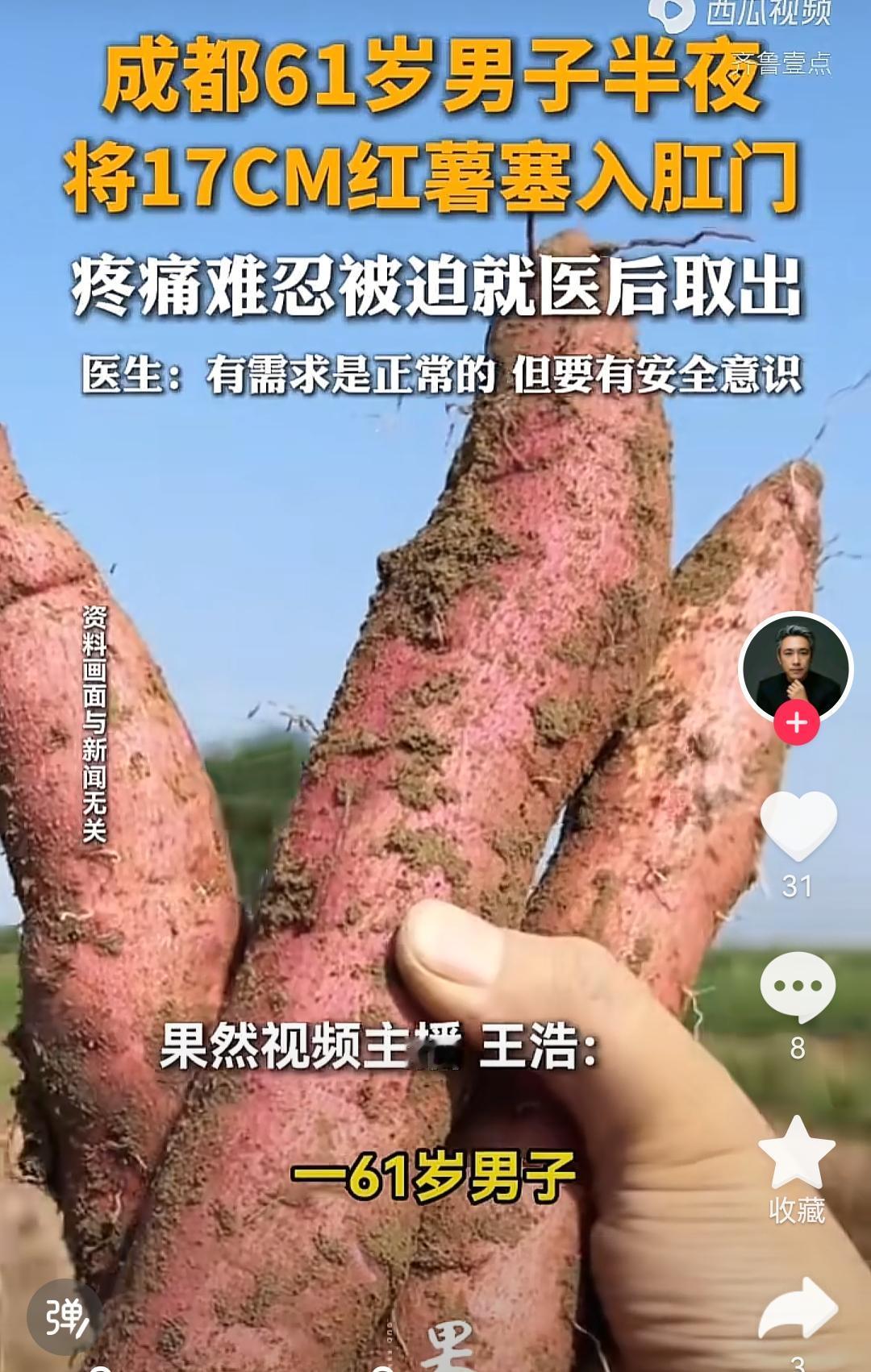 成都61岁男子将17cm红薯塞入肛门!半夜疼痛难忍被迫就医,医生:尺寸过大,得开腹。 近日,四川成都,一61岁男子因自行将一根长约17cm、直径 6-7cm的红薯塞入肛门,导致异物卡住无法取出,紧急前往成都肛肠专科医院就诊。 男子:医生听我狡辩,我在地里挖红薯拉屎的时候不小心滑倒了[流泪] 我好奇的是肛门那么小孔,红薯那么粗大,是怎么塞进去的?还那么长?塞的时候就不疼吗?! 61岁 17厘米的红薯 塞入屁股 特喵的 四川成都又上大分了 如果不取出来、明年春天估计会长出红苕藤来!! 人口老0化了,成都还是太超前。以后就是川云贵,川在后面我不放心。[笑哭] 亲戚朋友同事等去看望他,他要怎么面对,会不会尴尬? 不过说实话,现实中很多人都有自己独特的性癖,只不过没发生意外没让其他人知道[泪奔] 之前实习的时候还见过大扳手塞进去的,到医院手术取出来,到现在我也没想明白他咋塞进去的。