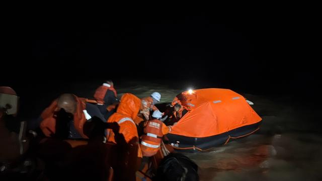 5时15分,“B-7360”救助直升机率先发现第一个救生筏,机组迅速将精确坐标同步至水面救助船艇。救助艇顶着风浪,循着灯光引导,艰难靠拢,成功将4名在严寒中瑟瑟发抖的渔民救起。仅9分钟后,直升机再次捕捉到第二个救生筏的踪迹,并继续引导救助艇开展救助,快速将剩余9名遇险渔民全部安全救起。至此,在短时间内,13名遇险渔民从冰冷的海浪中被全部救回。