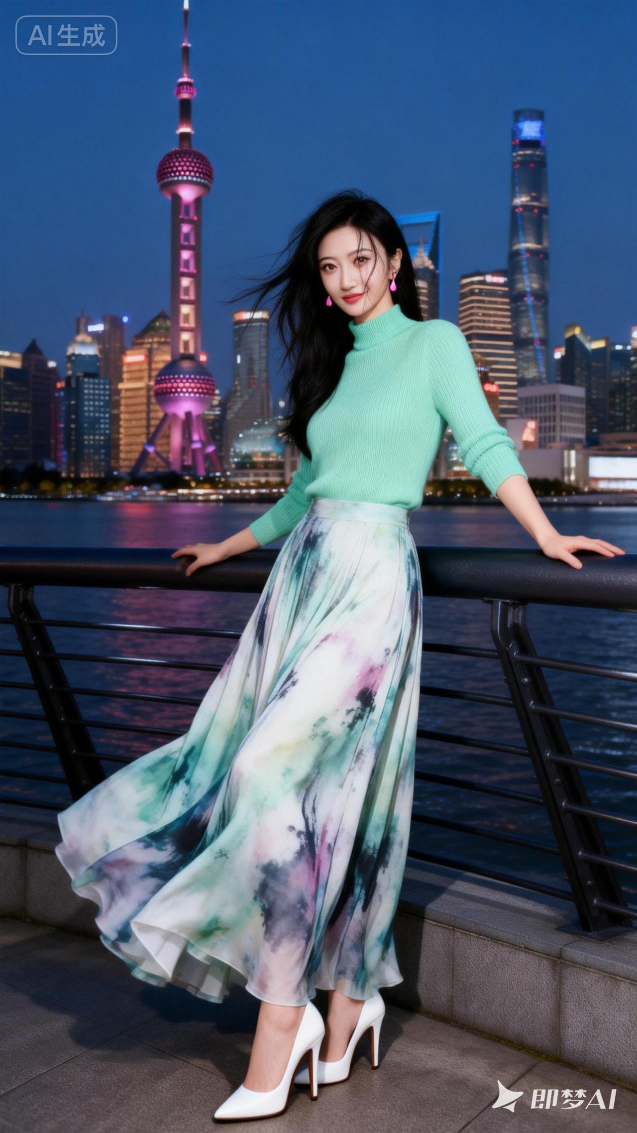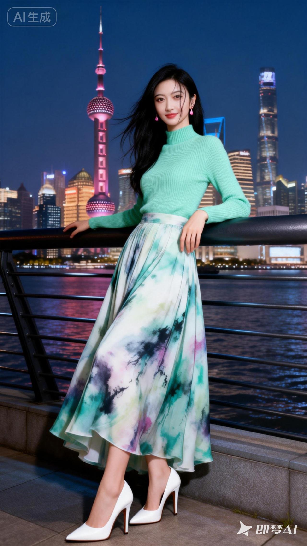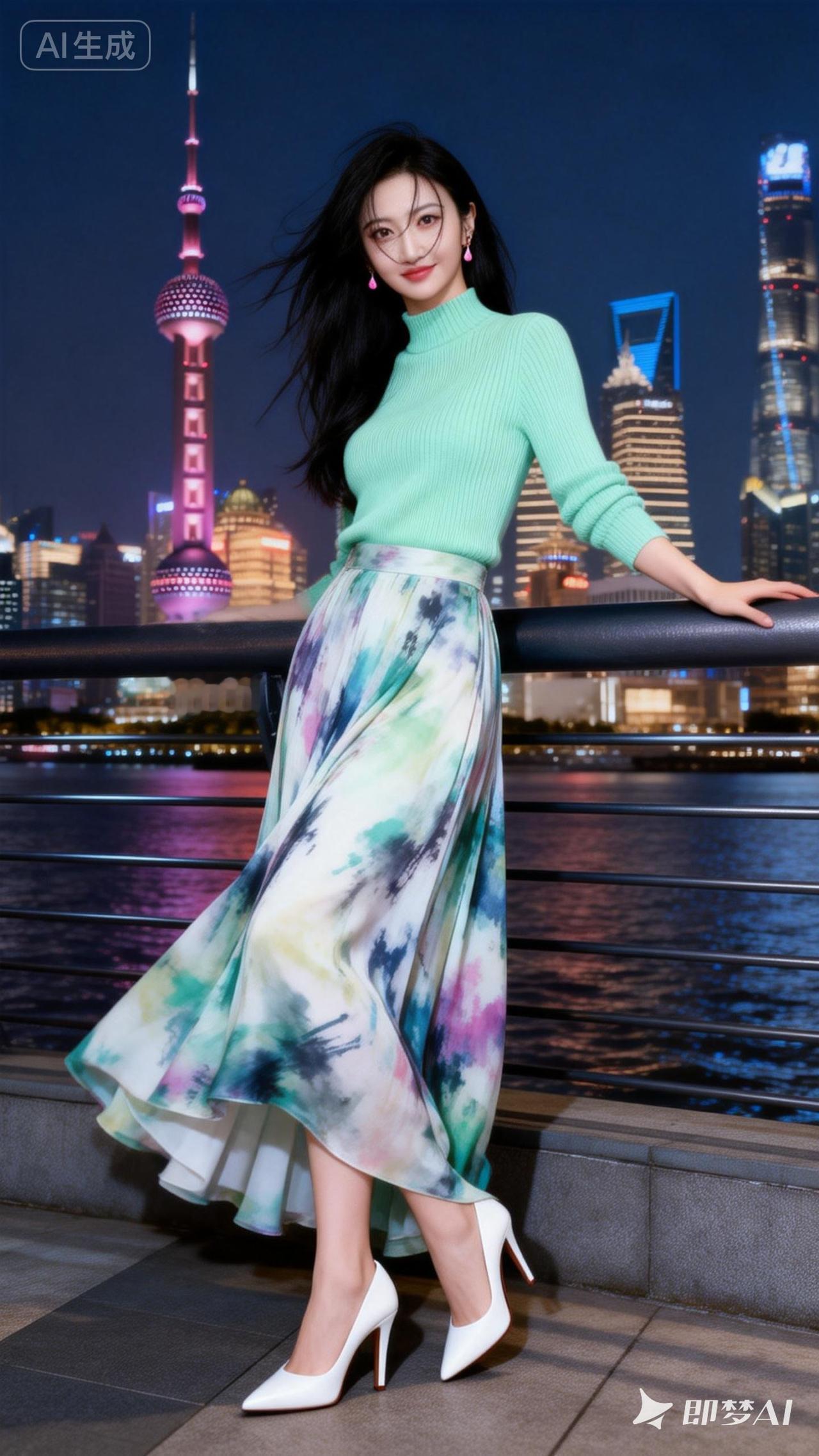 上海夜景下的时尚穿搭,绿色毛衣搭配彩色长裙,优雅动人!🌃👗✨