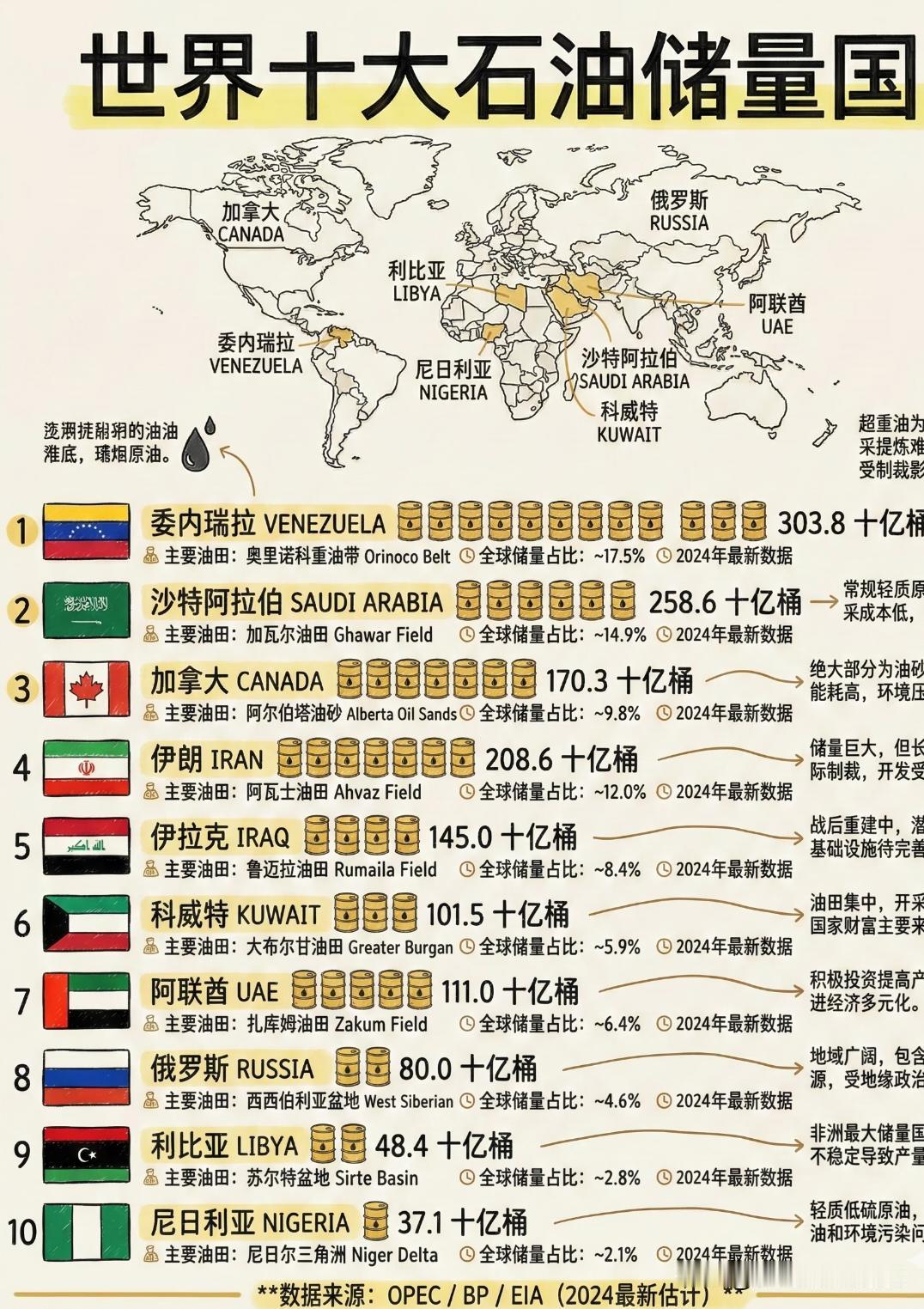 世界十大石油储量国,委内瑞拉第一 提到石油,你可能第一反应是沙特,但你知道全球石油储量最多的国家其实另有其人吗?🤔 石油作为“工业的血液”,不仅是能源,更是大国博弈的筹码。今天带大家扒一扒全球石油储量的顶级玩家,看看谁才是真正的“家里有矿”!👇 1. 委内瑞拉 (约3038亿桶) 👑 关键词: 储量冠军、重油。 虽然排名第一,但大多是像沥青一样的重油,开采成本极高且提炼难度大。空有宝山,却难以完全变现。 2. 沙特阿拉伯 (约2975亿桶) 🇸🇦 关键词: 成本极低、石油心脏。 沙特的油不仅多,而且好开采,成本全球最低。阿美石油公司的一举一动都能引发全球油价地震。 3. 加拿大 (约1681亿桶) 🇨🇦 关键词: 油砂。 储量惊人,但97%都在油砂里,开采过程极其“费钱”且不环保,对国际油价非常敏感。 4. 伊朗 (约1578亿桶) 🇮🇷 关键词: 长期受限。 作为中东老牌强国,储量丰厚,但受限于国际局势,其产能不能完全释放。 5. 伊拉克 (约1450亿桶) 🇮🇶 关键词: 潜力巨大。 经历多年动荡后,伊拉克正在努力恢复基建,是未来全球增产的重要来源。 6. 俄罗斯 (约1078亿桶) 🇷🇺 关键词: 资源大户、北极潜力。 除了现有的西伯利亚油田,北极圈内还埋藏着巨大的未开发财富。 7. 科威特 (约1015亿桶) 🇰🇼 关键词: 小而美。 国土虽小,但大布尔干油田是世界第二大油田,靠石油支撑起了极高的福利。 8. 阿联酋 (约978亿桶) 🇦🇪 关键词: 转型先锋。 绝大部分储量在阿布扎比。阿联酋正在利用石油财富积极投资新能源。 9. 美国 (约688亿桶) 🇺🇸 关键词: 页岩油革命。 虽然储量排第九,但靠着页岩油技术,美国现在是全球最大的产量国,实现了能源自给。 10. 利比亚 (约484亿桶) 🇱🇾 关键词: 非洲之冠。 非洲储量最大的国家,油质极佳(低硫),深受欧洲炼油厂喜爱。 💡 知识点:储量 ≠ 财富 能不能致富,还得看**“开采成本”和“政治环境”**。这就是为什么委内瑞拉空有第一储量,却没能像沙特一样富裕。 全球能源转型正在加速,你觉得这些国家谁能笑到最后?欢迎在评论区聊聊!💬