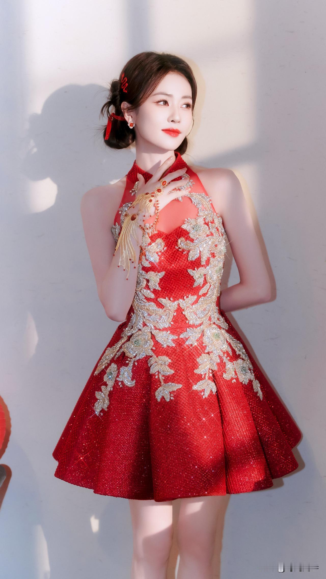 白鹿金丝印花红裙穿搭,透着新年的喜庆和平安喜乐的氛围。