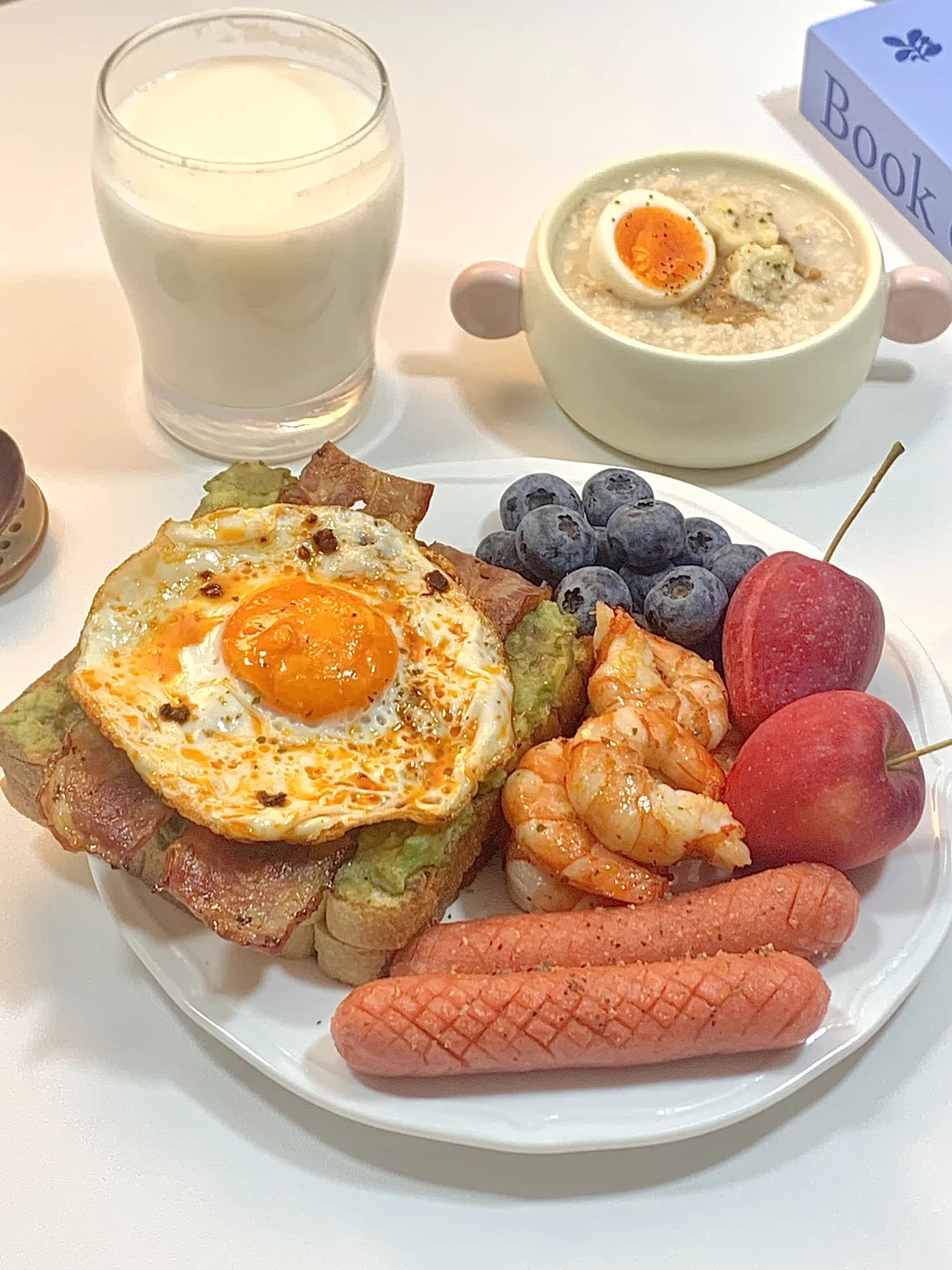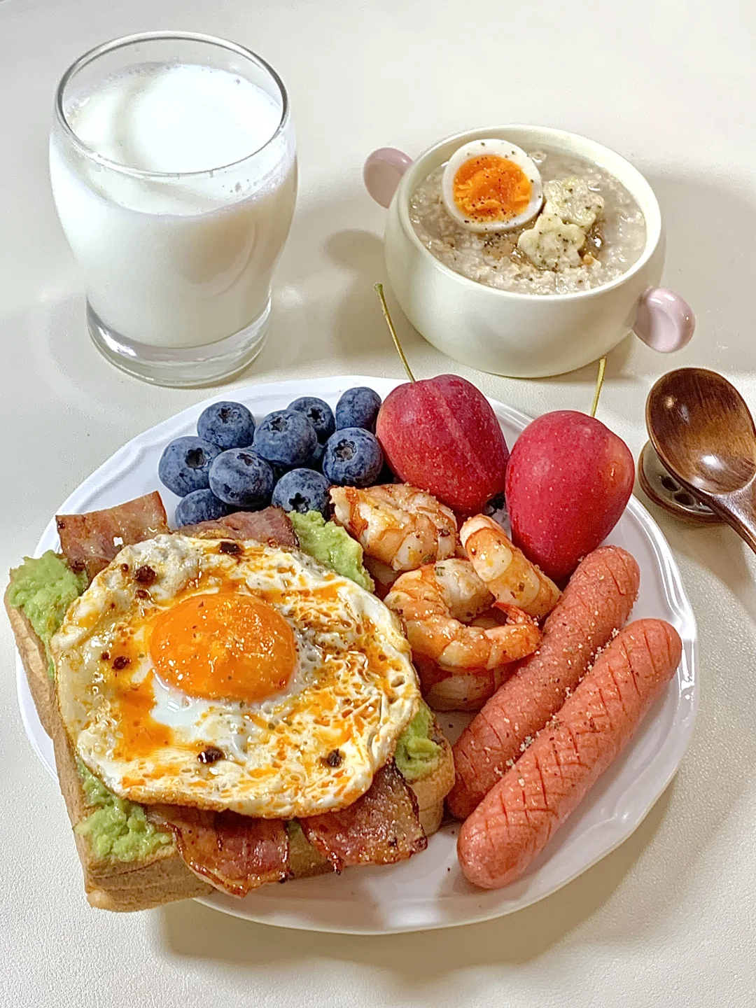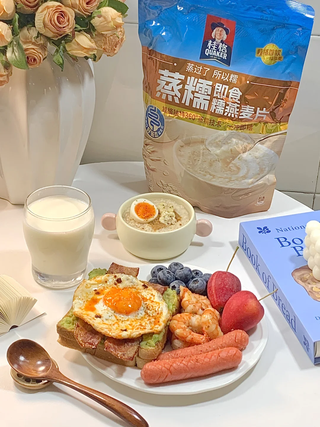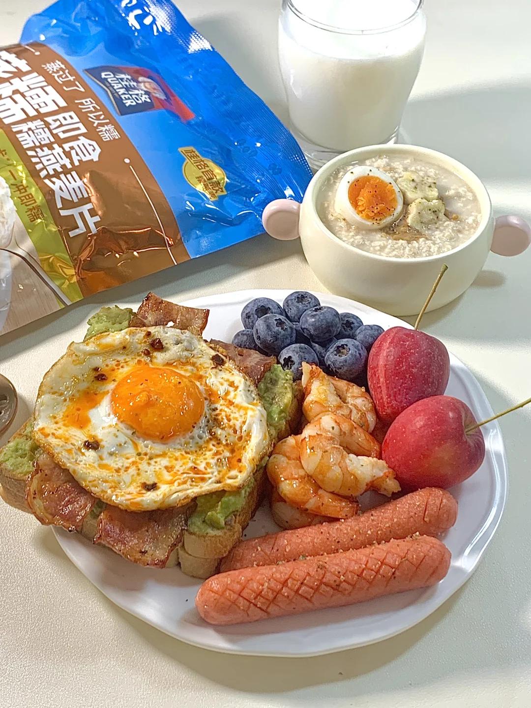 桂格糯燕麦+溏心蛋+花生酱香蕉+吐司+牛油果+培根+煎蛋+蓝莓+草莓+虾仁+烤肠