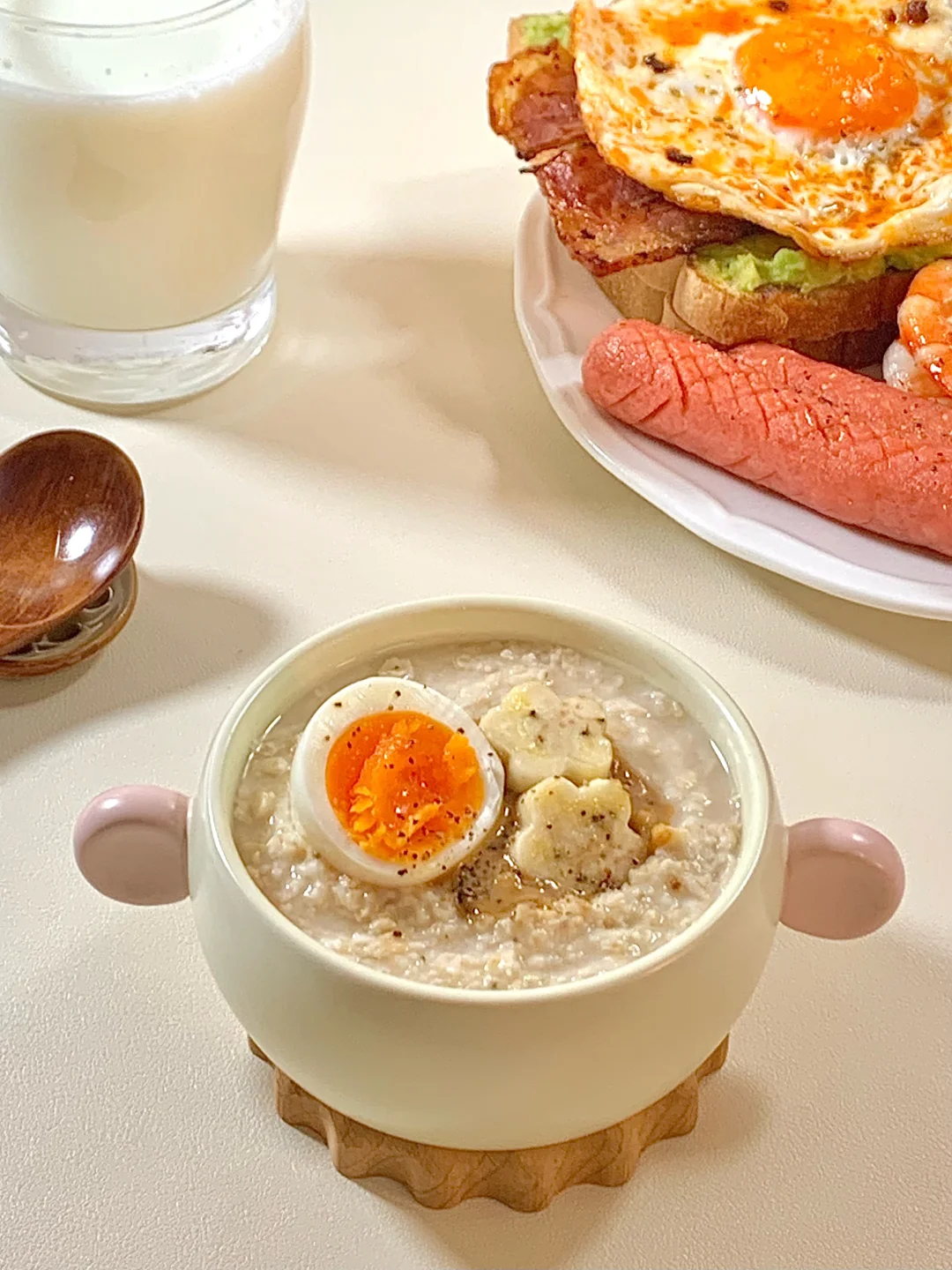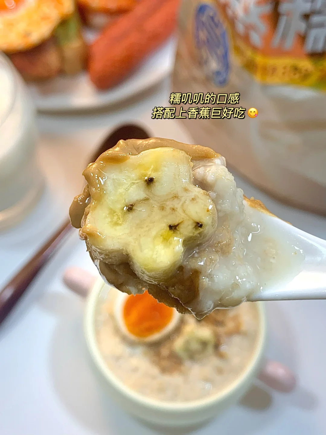 1️⃣桂格糯燕麦用热水冲泡搅拌均匀加入少许花生酱和溏心蛋 香蕉