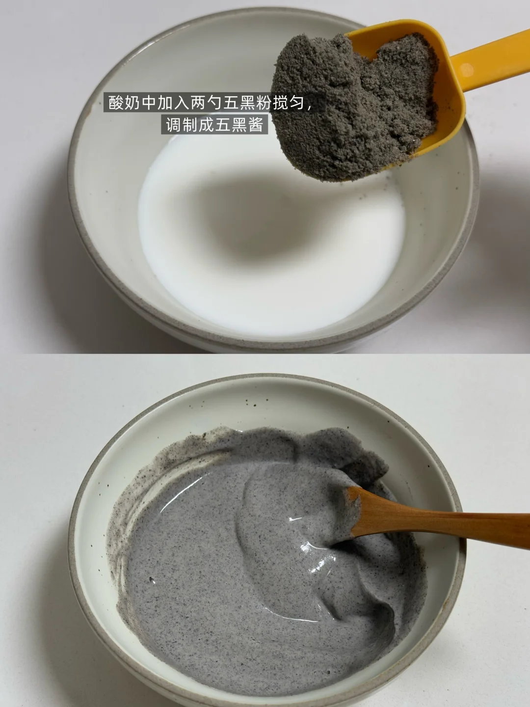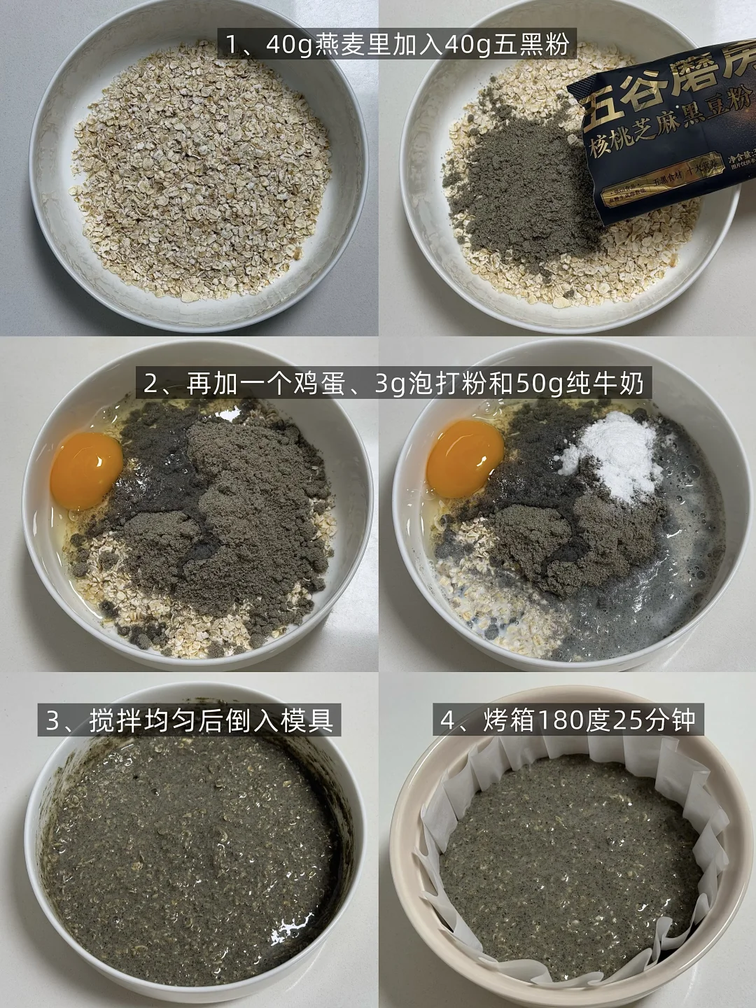 [向右R]食材:燕麦40g、五谷磨房核桃芝麻黑豆粉40g、鸡蛋1个、牛奶50g、泡打粉3g、无糖酸奶、果干