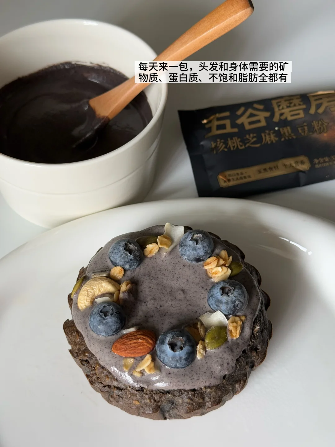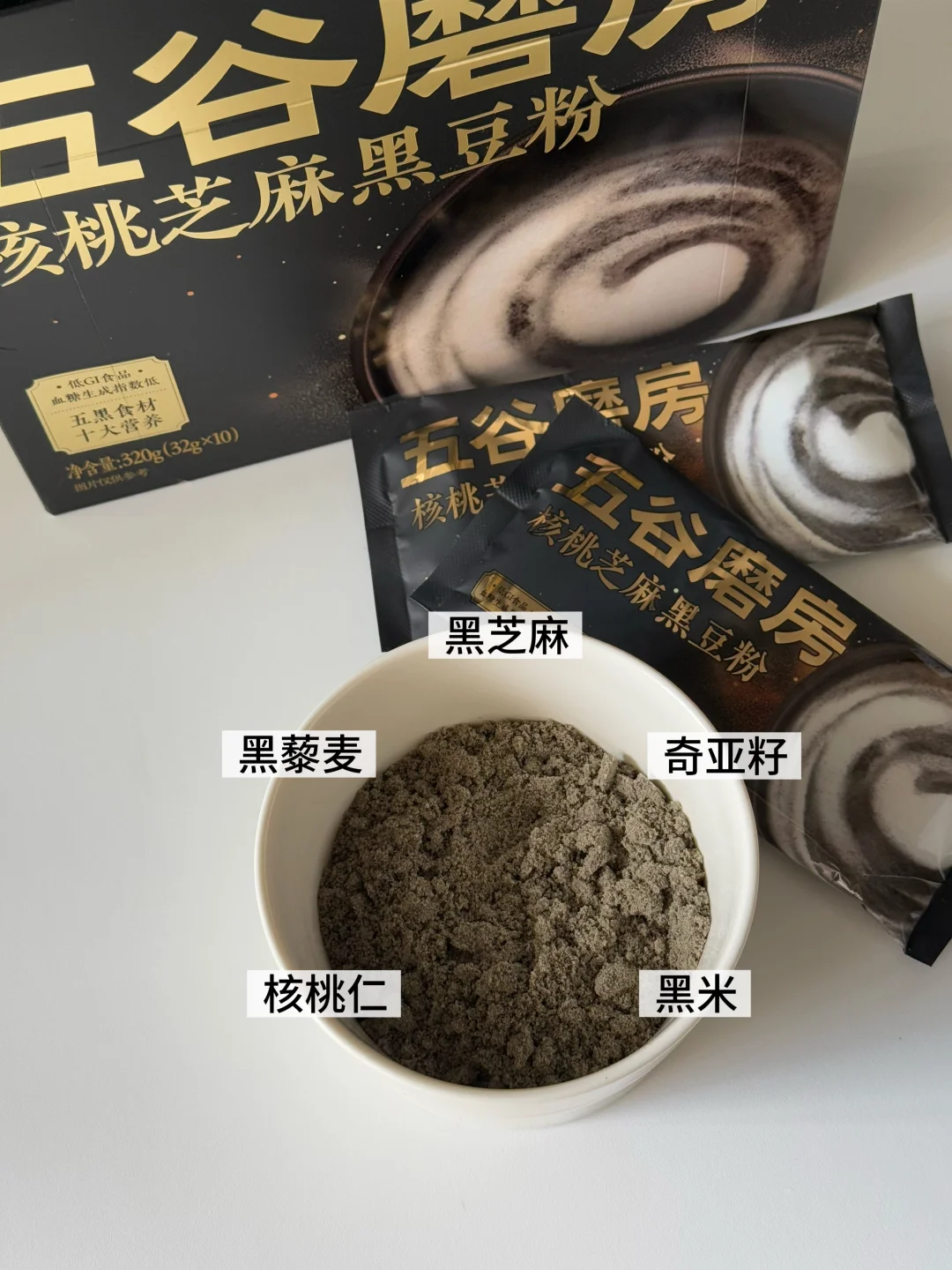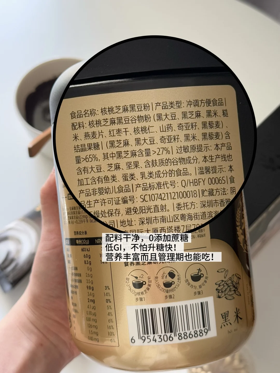 黑芝麻的好处无需多讲,五黑粉除了黑芝麻还有黑大豆、黑米、黑藜麦、核桃仁等等,全是女生应该多吃的好食材!!干净配料低GI,用五黑粉代替面粉来做烘焙真是养生女孩的首选!而且0添加蔗糖,对于注重糖分摄入的人也毫无负担~