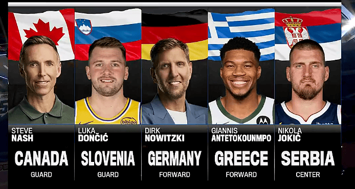 比赛的第二节,转播画面给出一组信息,内容为评论员杰夫-范甘迪给出的国际球员历史全明星阵容,详情如下:
