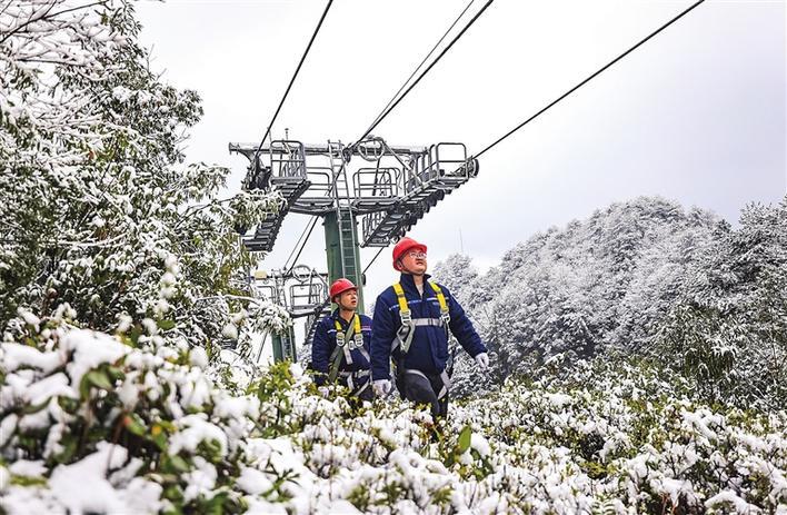 近日,随着气温降低,湖南各地的能源和基础设施出现霜冻现象。图为2026年1月1日,湖南张家界国家森林公园杨家界索道工作人员在巡检设备。新华社发(吴勇兵摄)