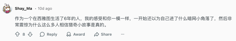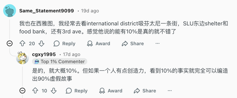 然而,Reddit上另一部分生活在西雅图的华人对此持有保留态度。有人推测最猎奇的故事大概是由10%的事实进行艺术加工后形成的。