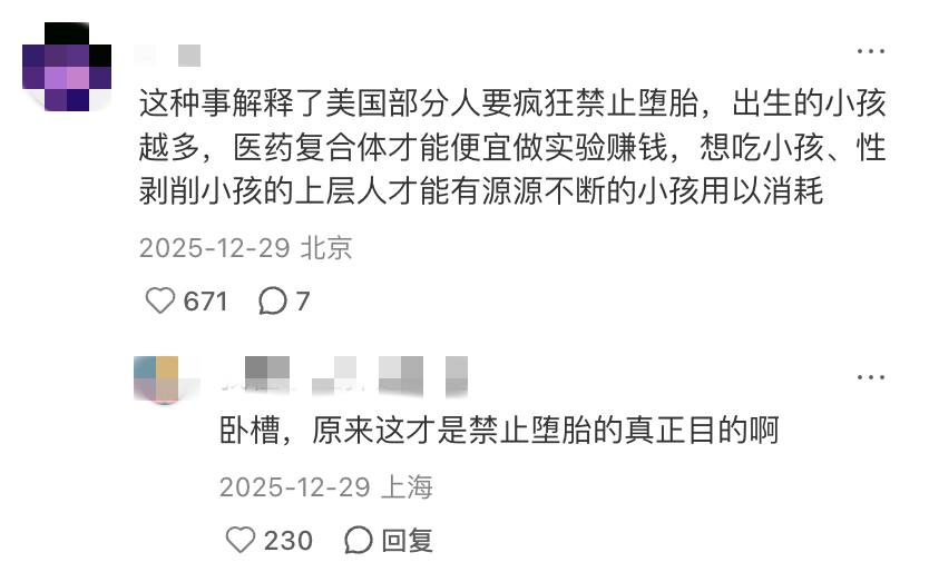 美国幼儿园的晚餐是吃活人心脏;留学生不吸毒就会被霸凌;大街上的尸体就像废纸壳,人人都抢;反堕胎是为了让儿童做生化实验。甚至还有谣传说,《小鬼当家》的童星被做成了富豪的皮鞋。