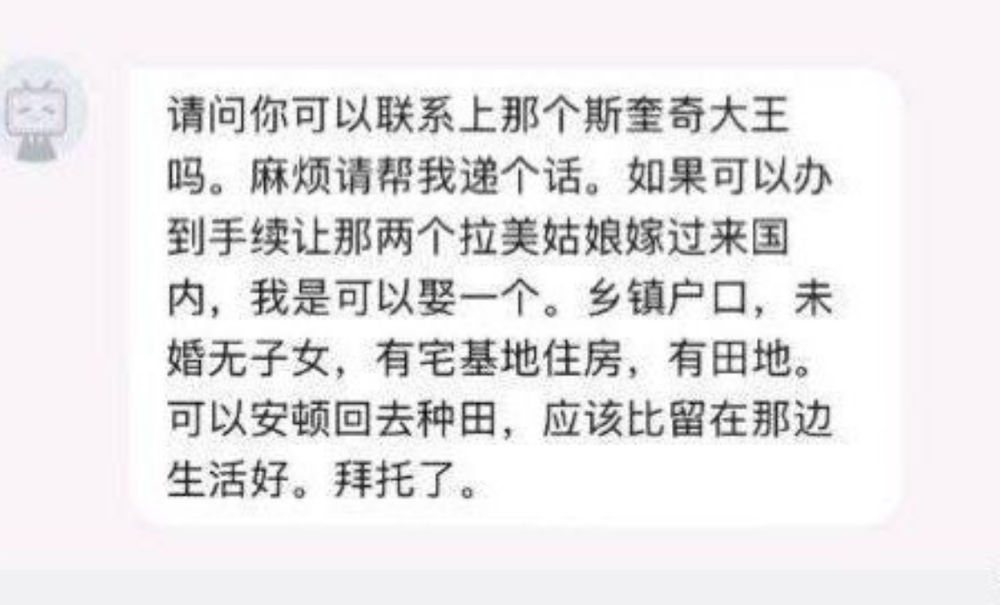 后续有一张网传的截图,一位男性网友言辞恳切,声称愿意献上宅基地,迎娶这对拉美姐妹花。