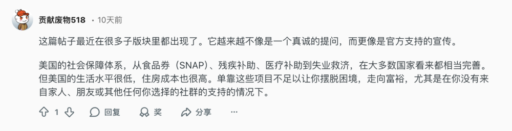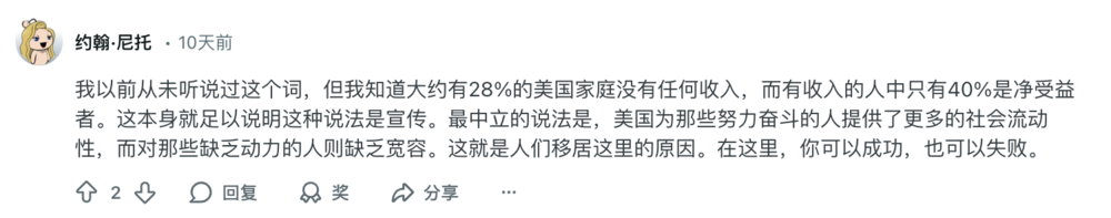 还有一位美国网友是这么说的:美国本身就是一个风险高、利润大、试错成本低的国家,它对缺乏动力的人非常残酷。