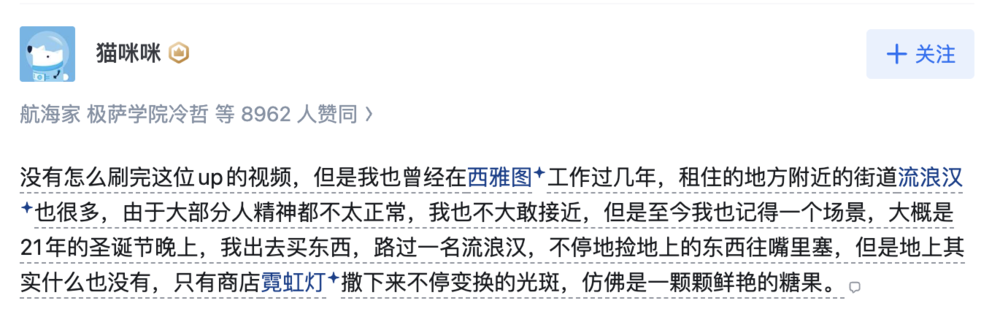 知乎用户@猫咪咪写下过一段令人动容的文字:西雅图街头的流浪汉不停捡地上的东西往嘴里塞,但其实地上什么也没有,霓虹灯的光斑仿佛一颗颗鲜艳的糖果。