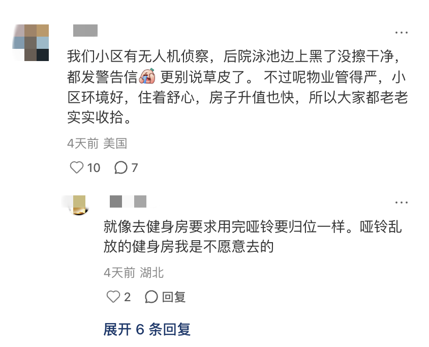 但是,住在一个社区里,你就要遵守一个社区的规矩,不能随意破坏社区氛围。比如你不能把墙刷成绿的,不能天天在家门口烧烤蹦迪。毕竟谁都不想让自己所在区域的房价受到影响。