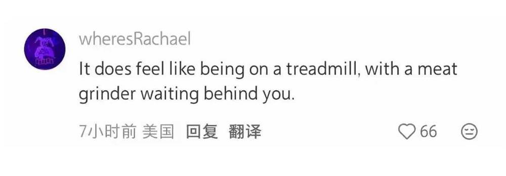 小红书上,一位美国网友的形容是,生活就像你处在一个不会停止的跑步机上,而你的身后是一台绞肉机在等着你跑不动。