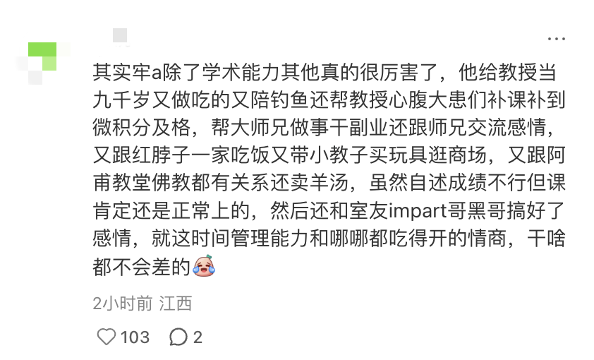 总而言之,一个生物医学专业的本科生,虽然英语能力不详,但却是导师门下的“学术九千岁”,在每天高强度学习的情况下完成大量收尸工作,同时保证5-6个小时高强度直播用来“回san”,闲暇之余还要在社区做慈善,结交各路豪杰。