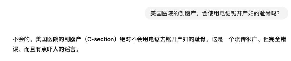 ChatGPT对此的解释是,电锯锯开耻骨的说法系经典谣传,现代医学中并不存在这种方式。唯一可考的资料是17世纪始,一种名为“耻骨联合切开术”(Symphysiotomy)的手术方法,被广泛用于孕妇难产的状况当中,19世纪以后,“耻骨联合切开术”慢慢被医学界弃用了。被谣传的原因可能是电凝刀和吸引器的声音听起来像电锯。
