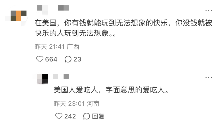 有人得知美国人民过得不好,自己心里好受多了。至少还能吃拼好饭喝蜜雪冰城,至少还活着,至少没有被野狗掏肛。