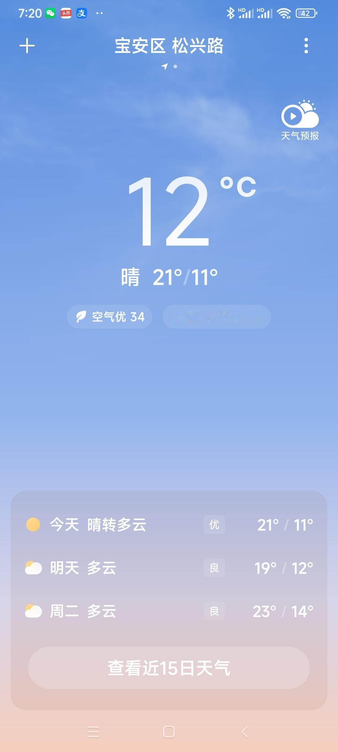 我的今日状态:😁轻松愉快 我这里的天气:☀️晴天深圳今天晴转多云,气温11度到