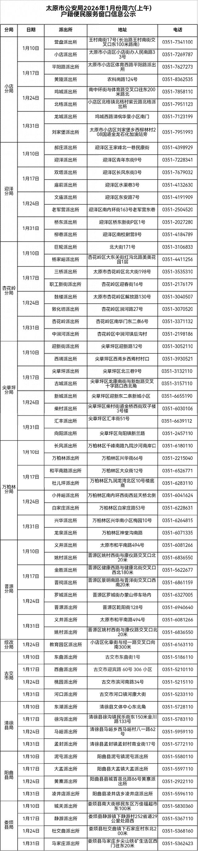 以上为太原市公安局公布的2026年1月份周六(上午)户籍便民服务窗口信息,各窗口后续服务时间,请通过公安部门官方信息渠道了解。