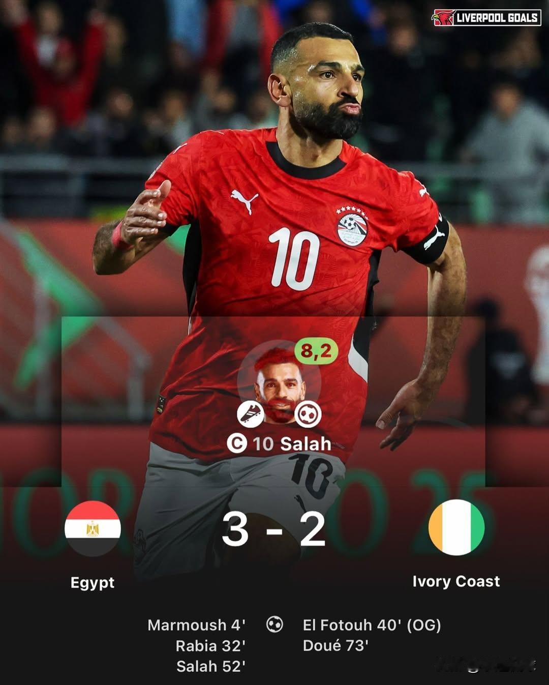 离开利物浦,萨拉赫杀疯了!非洲杯历史第一人诞生! 非洲杯¼决赛,萨拉赫再次主宰比赛! ✅上半场精妙助攻撕开防线 ✅下半场冷静推射锁定关键球 ✅单届赛事直接参与5球(4球1助)——创造个人非洲杯生涯新高! ✅连续4场破门,场场carry! ✅更可怕的是:他已在非洲杯攻破11支不同球队的大门,历史第一人!🏆 赛后官方最佳球员奖杯直接颁给这位埃及之王!