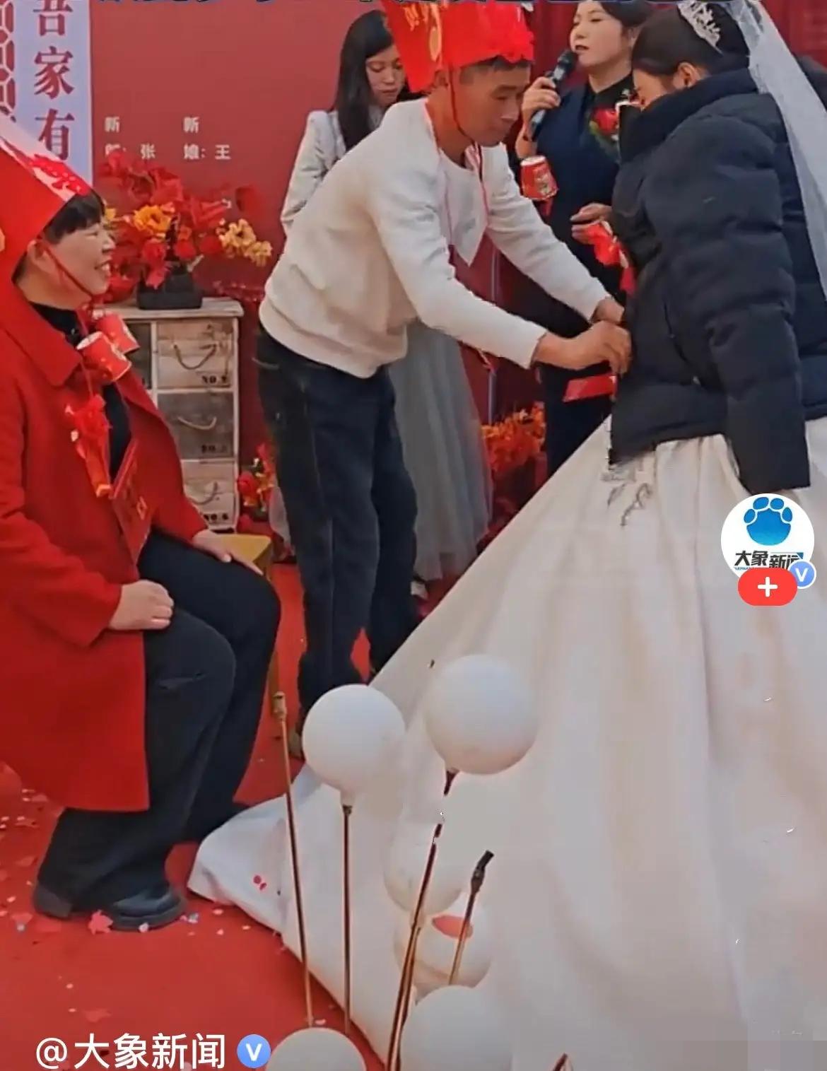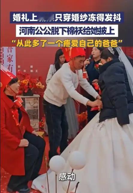 冬日婚礼现场寒风呼啸,新娘一袭单薄礼服,冻得瑟瑟发抖,双手紧紧抱在胸前。身旁的公公看在眼里,二话不说脱下身上厚实的棉袄,快步上前细心为她披上。带着老人体温的棉袄,瞬间驱散了刺骨寒意。这一幕被宾客抓拍,暖心举动引得阵阵称赞,简单的动作里,满是长辈对晚辈真切的疼惜与关爱。