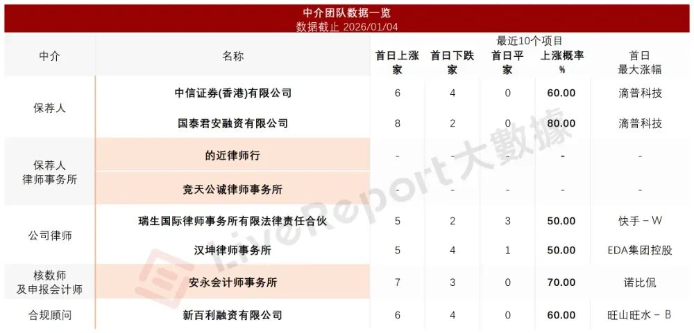据LiveReport大数据统计,斯坦德机器人中介团队共计8家,其中保荐人2家,近10家保荐项目数据表现尚可;公司律师共计2家,综合项目数据表现平平。整体而言中介团队历史数据表现一般。