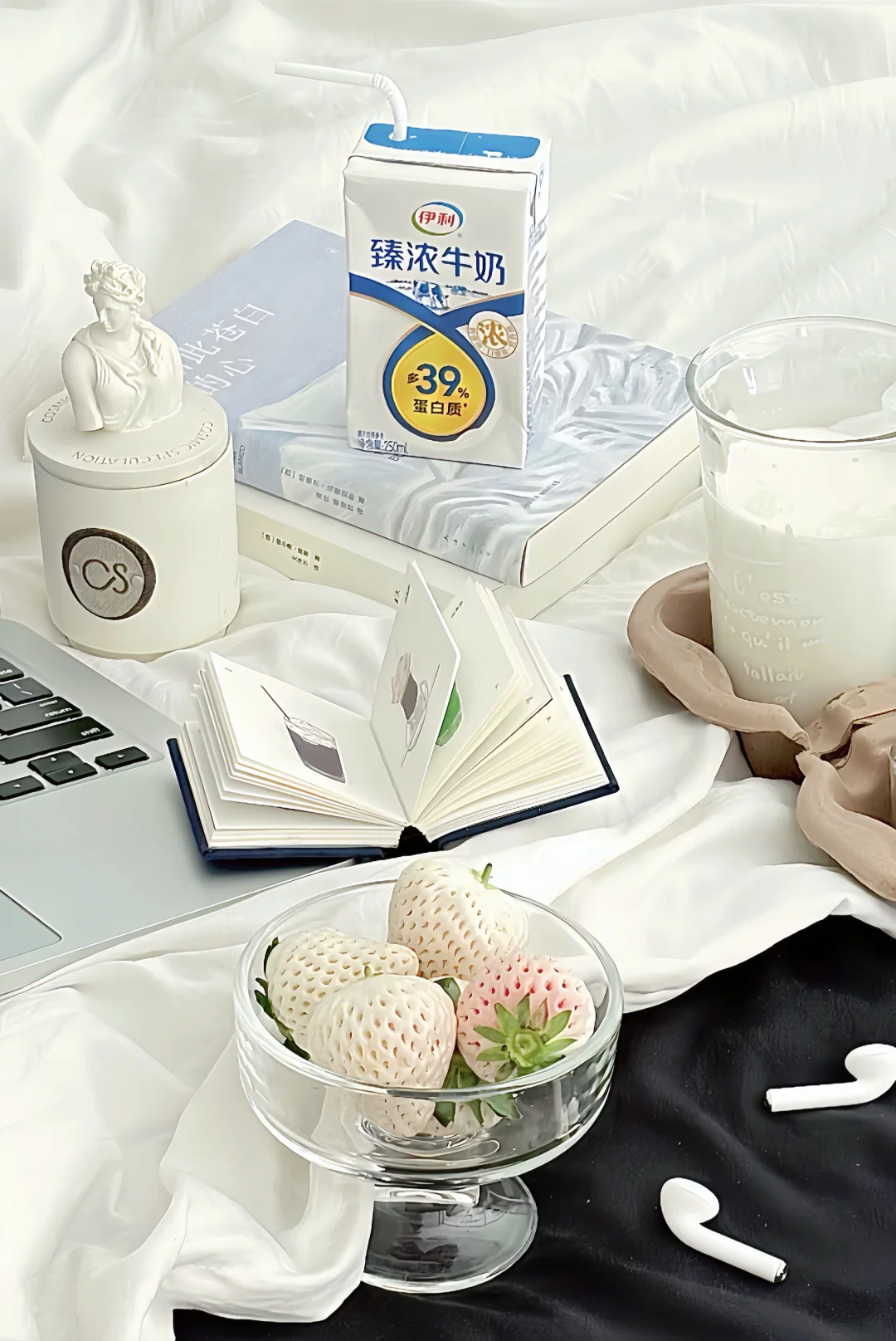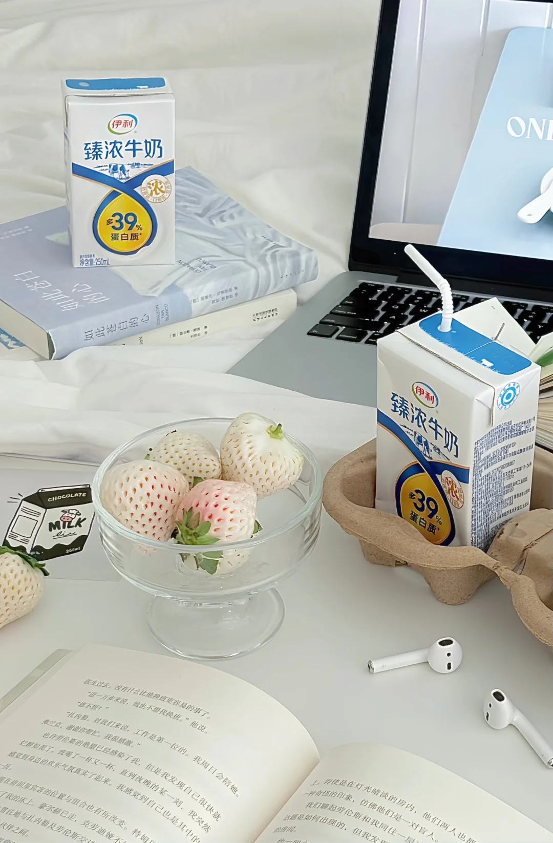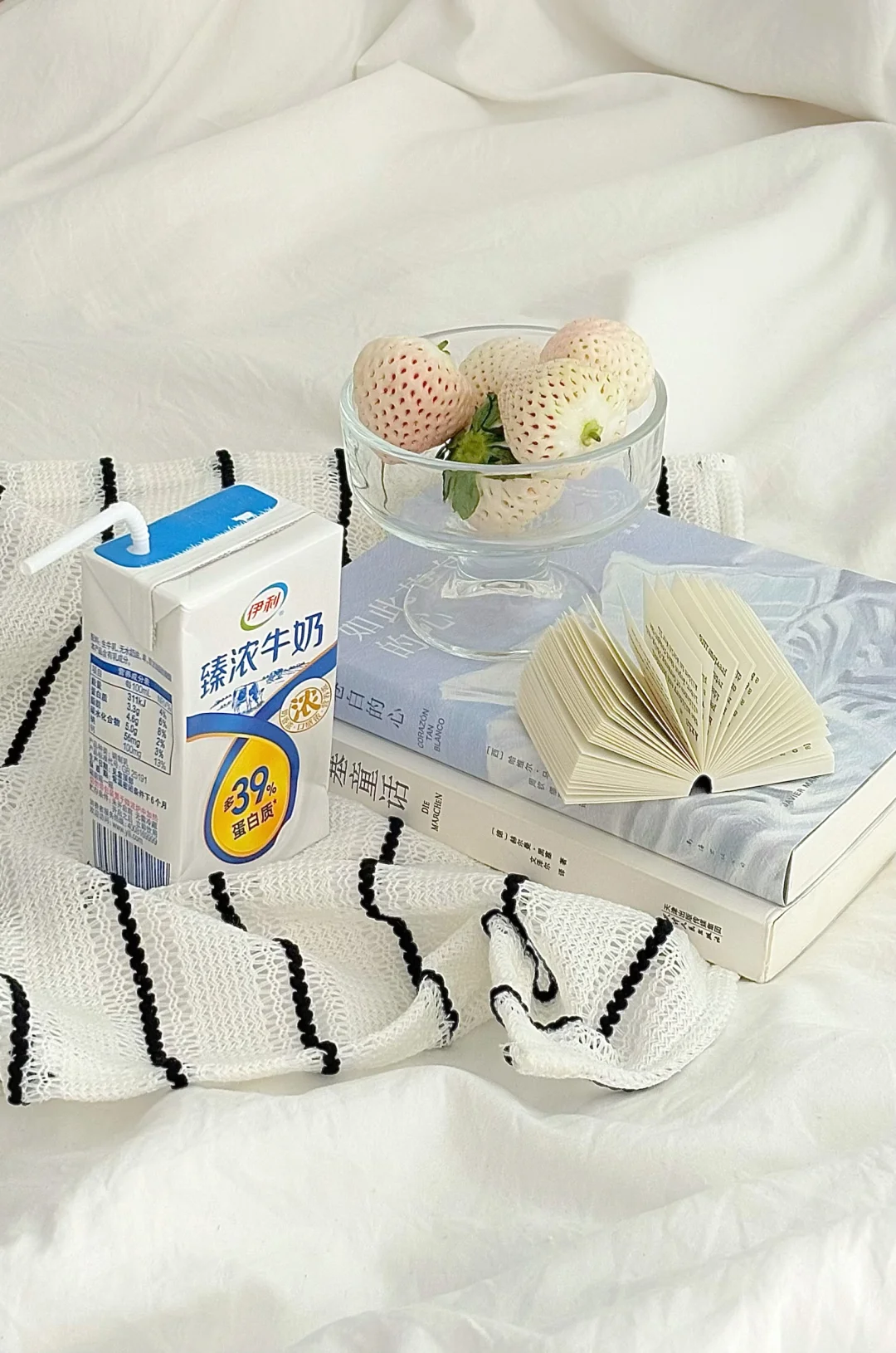 透明玻璃杯盛白草莓🍓➕几本书📕