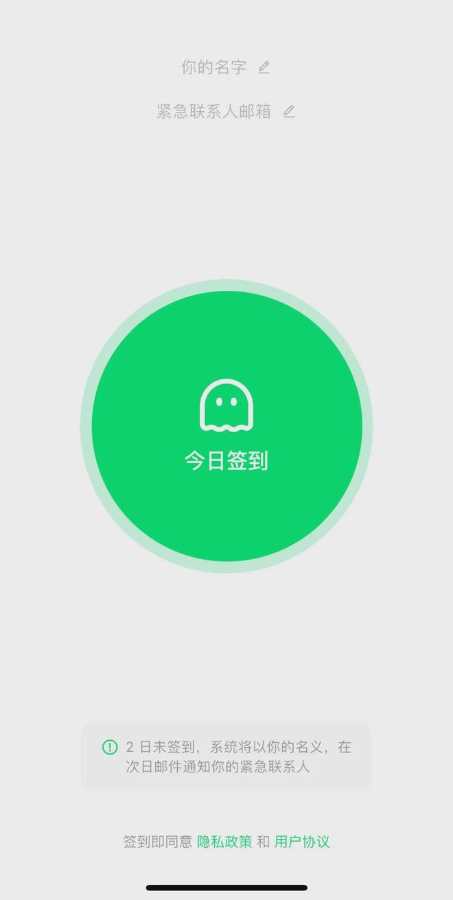 记者购买下载该软件后,发现该软件界面较为简洁。中间有一个“签到”按钮,并提醒“2日未签到,系统将以用户的名义,在次日邮件通知用户的紧急联系人”。