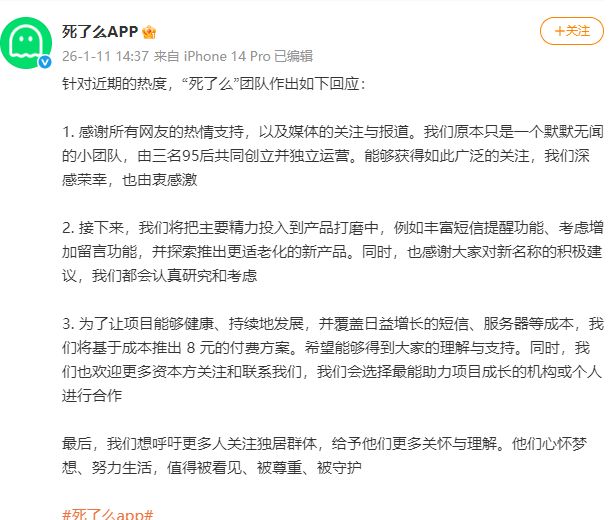 吕先生表示,早在两三年前他们就在社交平台上留意到相关需求,“有网友提到‘死了么’App,这个创意出来之后有很大的讨论度。我们看到了其中的需求,并且这件事本身也很有意义,于是尝试去注册这个名字,发现可以注册,后续又用了一个月时间完成了开发。”