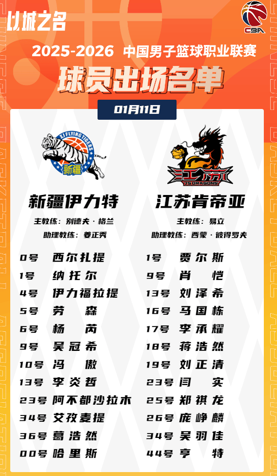 虎扑01月11日讯今晚CBA常规赛,新疆对阵江苏的大名单已经公布。