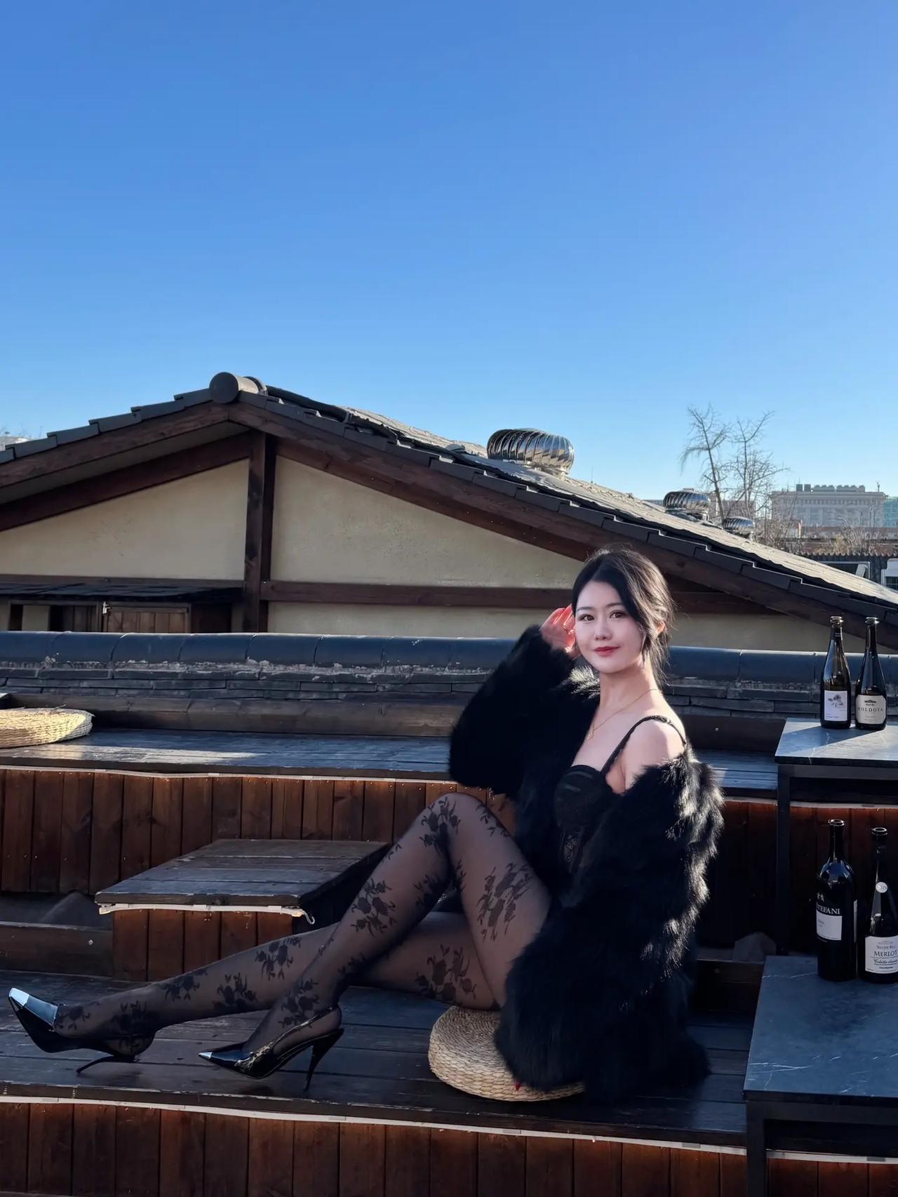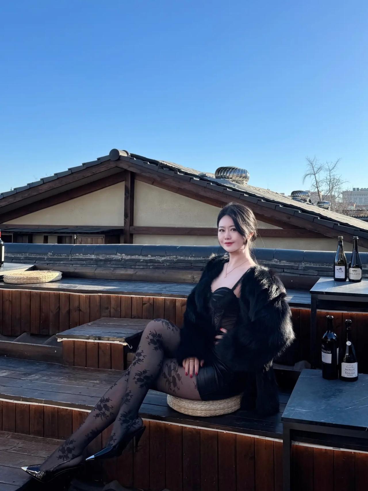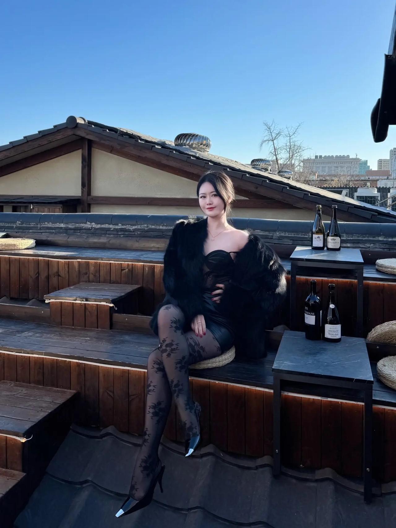 冬日暖阳下的咖啡馆,优雅黑衣女子与美酒相伴。