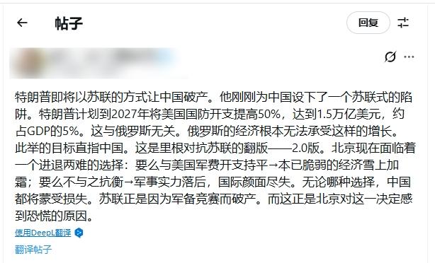 美国“中国崩溃论”专家魔怔了:特朗普增加1.5万亿军费,一定能拖垮中国 美国某些“中国崩溃论”爱好者已经疯了。 是这么回事:前几天特朗普曾声称他计划将美国2027年的军费预算增加到1.5万亿美元,然后一位“中国崩溃论”支持者跳了出来,在社交媒体上开始论证“中又输”。 他的逻辑是这样的:特朗普所谓的“1.5万亿美元军费开支”是为中国设下的“苏联式陷阱”,即特朗普想和中国搞军备竞赛,所以中国“面临一个两难的抉择”,要么与美国的军费开支持平、拖垮经济,要么军事实力落后、颜面尽失,“但无论是哪种选择,中国都将蒙受损失”。 我们翻了一眼原推文的评论区。非常滑稽的是,有相当多的美国网友都支持这位“专家”的观点,而其他国家的网友则对其报以嘲讽,认为他对中国的经济规模与工业产能一无所知就信口开河。 事实上,把中国当成苏联,然后拿美苏冷战模板硬套到今天的中美博弈并玩历史影射,可以说是美国某些冷战魔怔人根深蒂固的路径依赖:美国赢过一次冷战,就让他们认为历史可以无限复刻,只要把美国军费拉到天上去,中国就会像苏联一样被拖垮。 但现实是:中国不是苏联,美国也不是当年的美国。如今一个依靠债务驱动、被军工复合体吸血的金融国,企图与世界第一大工业国比拼可持续的军备生产与投入,简直就是个笑话。