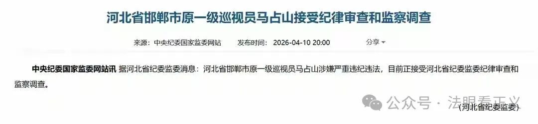 4月10日,据中央纪委国家监委官方网站权威发布:邯郸市委原常委,政法委原书记马占山,涉嫌严重违纪违法行为,接受河北省纪委监委纪律审查和监察调查。
