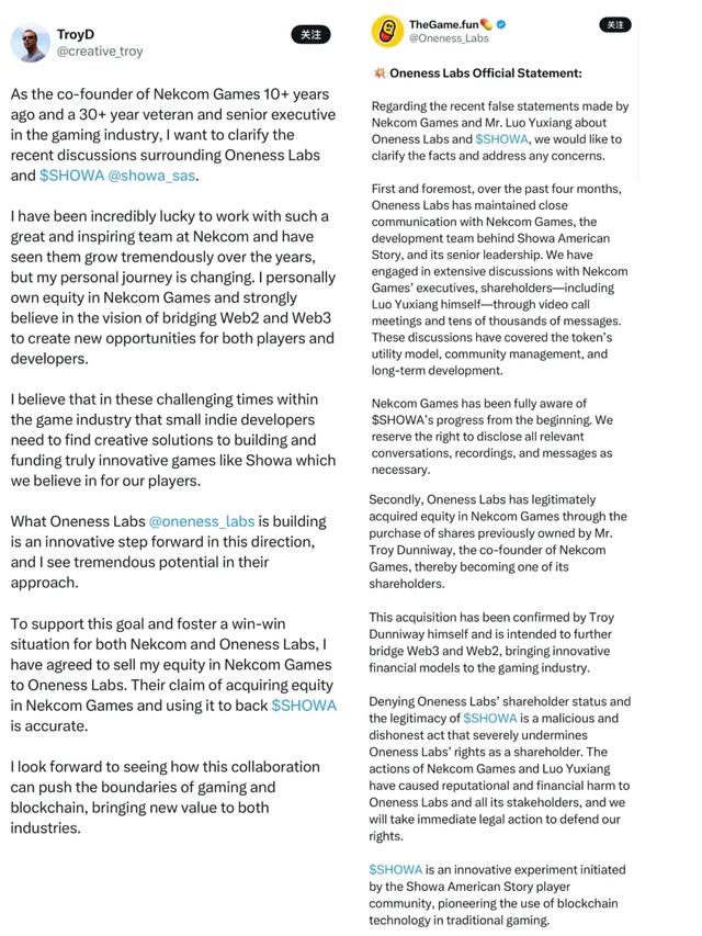 其次,Oneness Labs的确通过收购铃空游戏联合创始人Troy Dunniway持有的公司股权,成为铃空游戏的股东之一。这一收购交易已由Troy Dunniway本人确认。否认Oneness Labs股东的身份和SHOWA的正统性,是恶意不诚实的行为,同时也严重损害Oneness Labs作为铃空股东的权益。