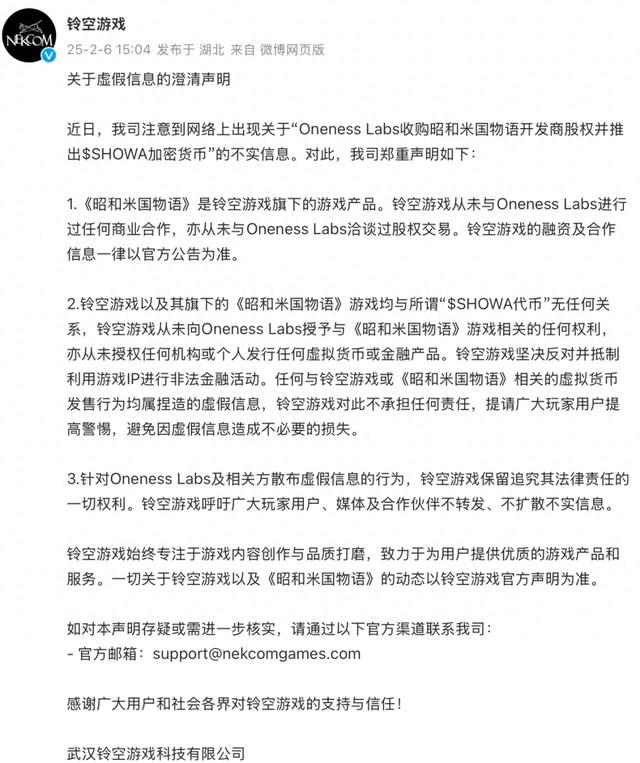 当天,铃空游戏发表了一则澄清说明,称“Oneness Labs收购《昭和米国物语》开发商股权并推出$SHOWA加密货币”为不实信息,并表示铃空从未与Oneness有过商业合作,亦从未与其有过股权交易的洽谈。