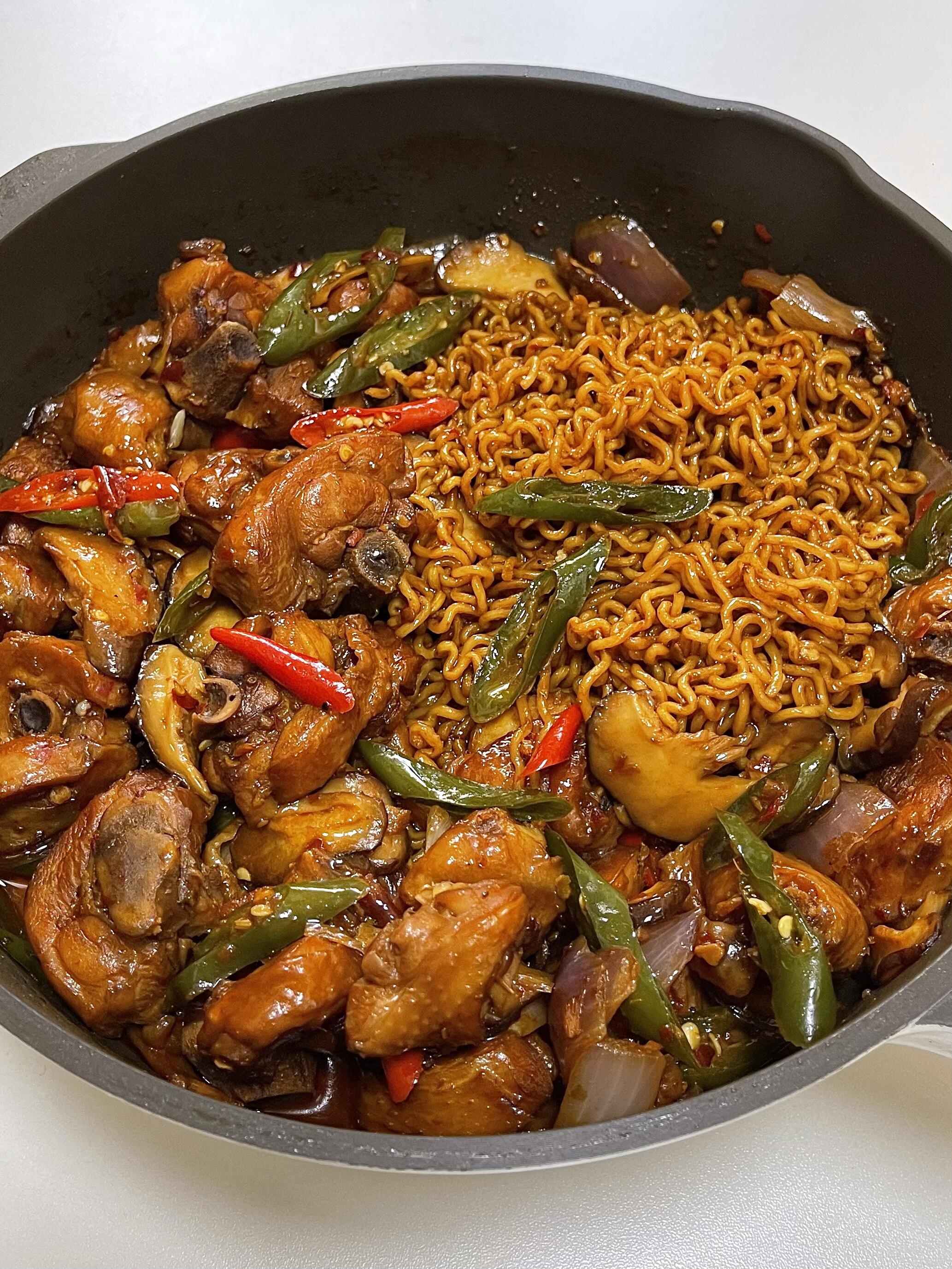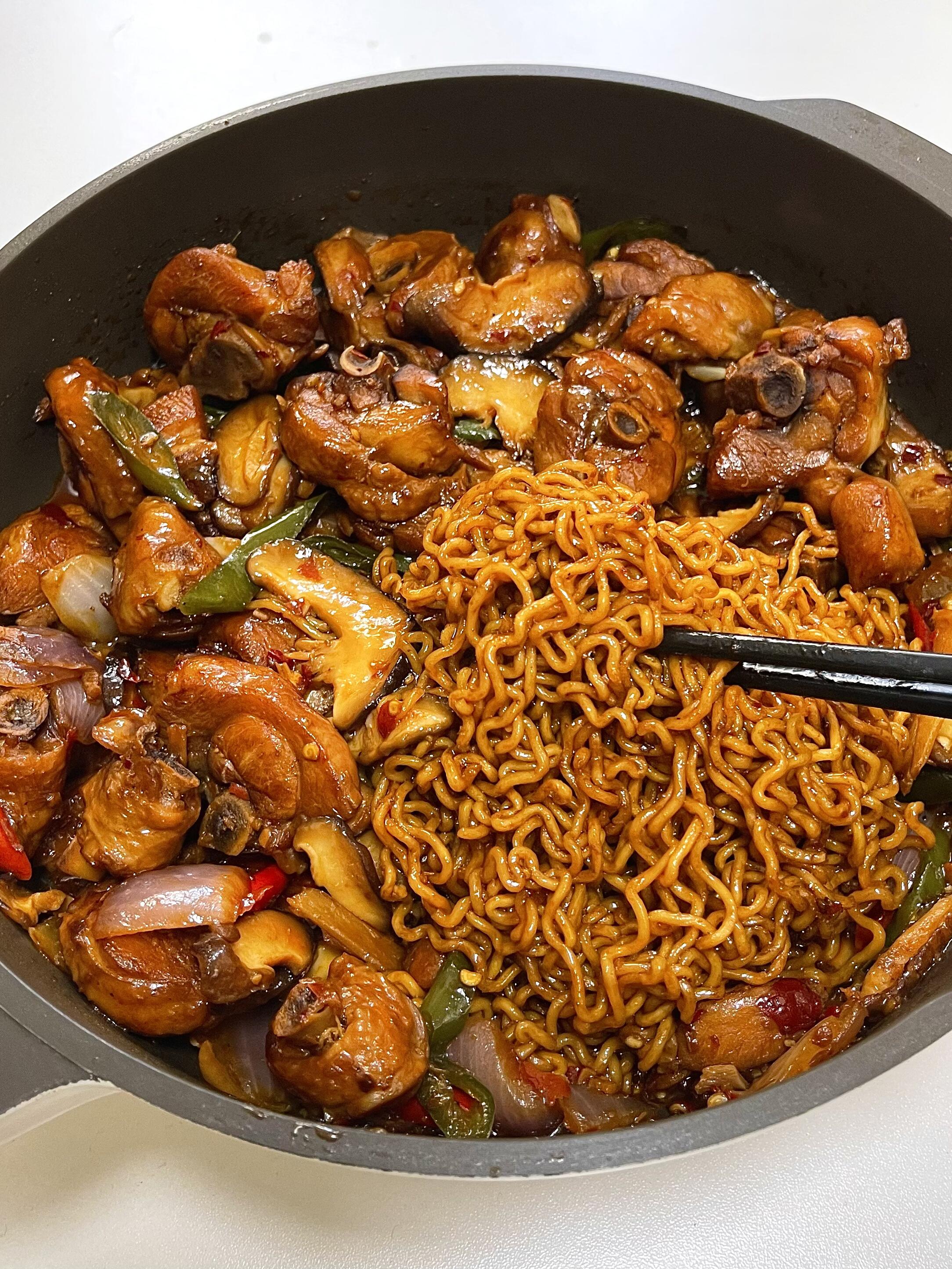 5. 加入泡面:最后加入泡面,焖熟即可,泡面吸满了鸡公煲的汤汁,一口下去,简直太满足了!