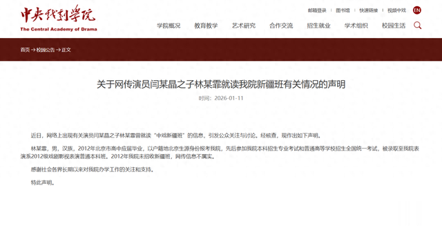 1月11日,中央戏剧学院官网发布声明: