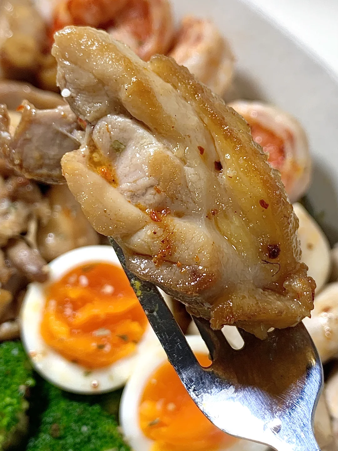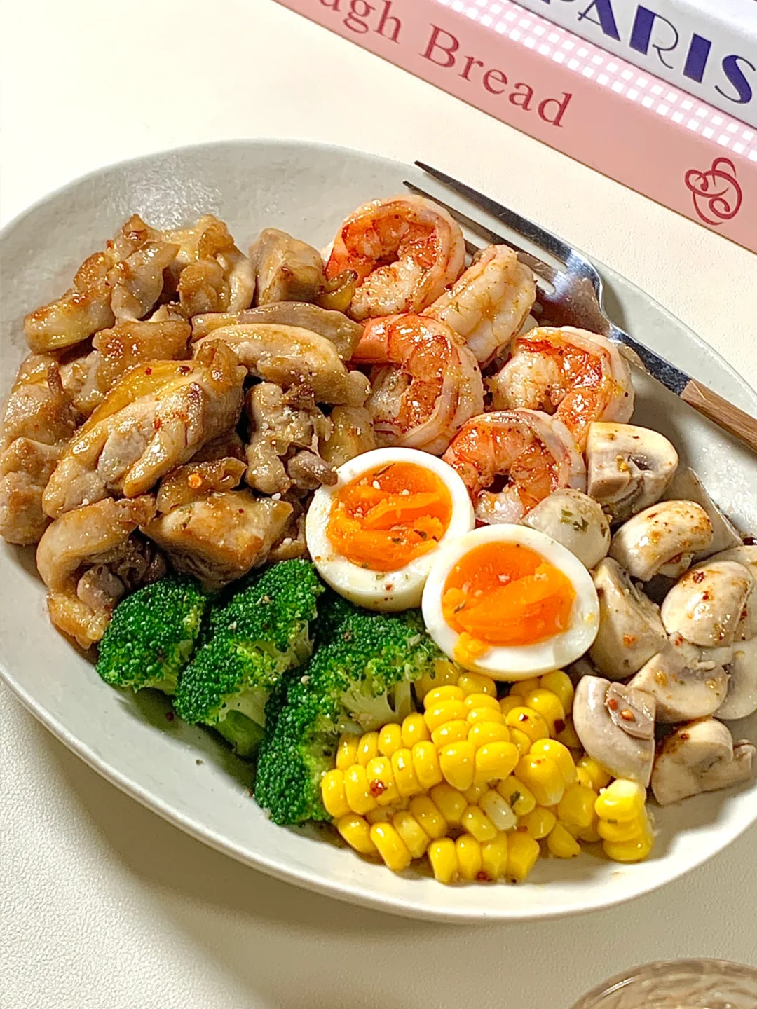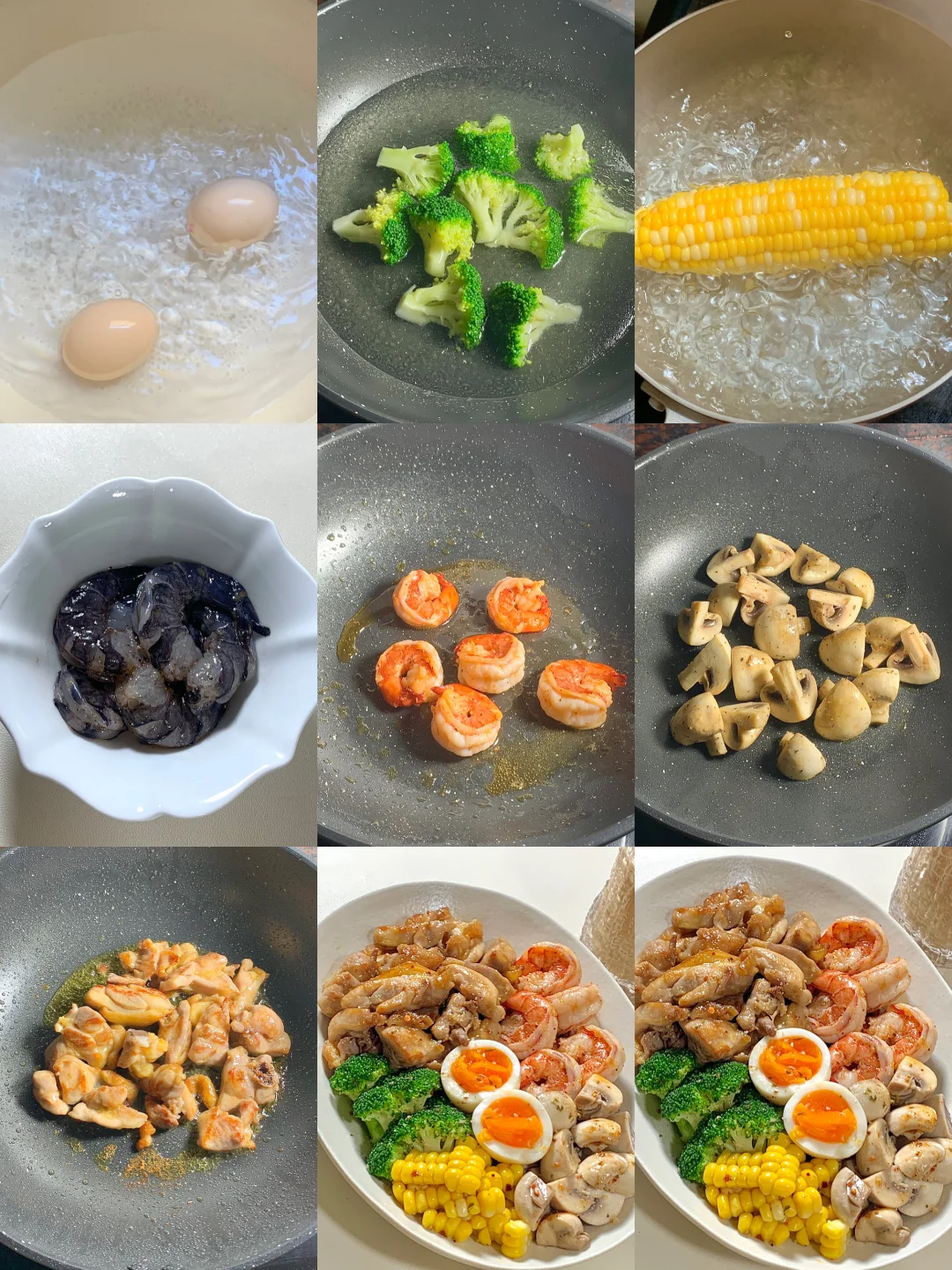 今天晚餐吃的减脂晚餐 《溏心蛋鸡腿肉拼盘》嘎嘎好吃! 🥦食材:西兰花、虾仁、鸡蛋、玉米、口蘑、鸡腿肉 🫕做法: 1️⃣鸡蛋熟八分钟捞出过凉水 2️⃣玉米煮熟、西兰花焯水1分钟捞出来 4️⃣鸡腿切块+1勺生抽+1勺蚝油+黑胡椒盐腌制10分 5️⃣起锅烧油鸡腿肉煎至两边微焦熟透 7️⃣虾仁黑胡椒盐腌制10→起锅烧油虾仁煎熟→口蘑煎熟 ✨所有食材装盘撒上黑胡椒盐就可以开吃啦~ 🍃一盘都是健康又低脂的食材,炫儿吧嘎嘎香😋