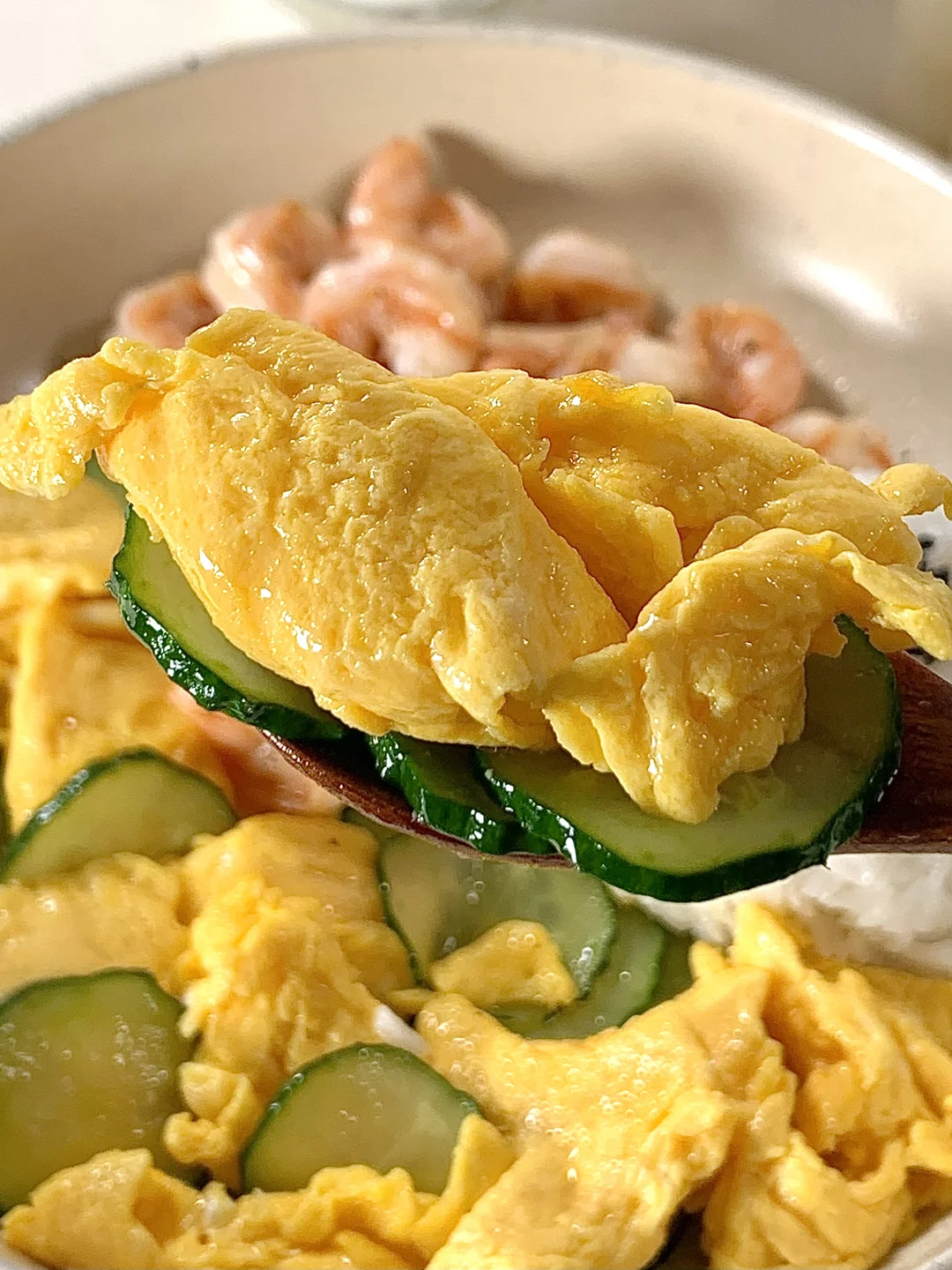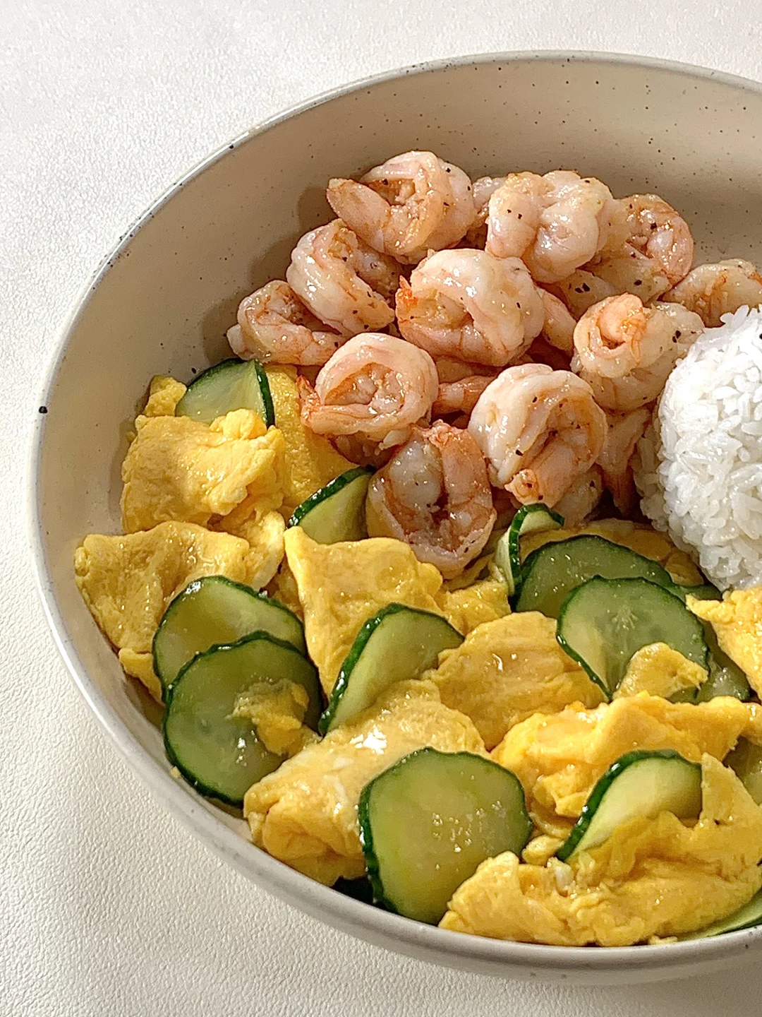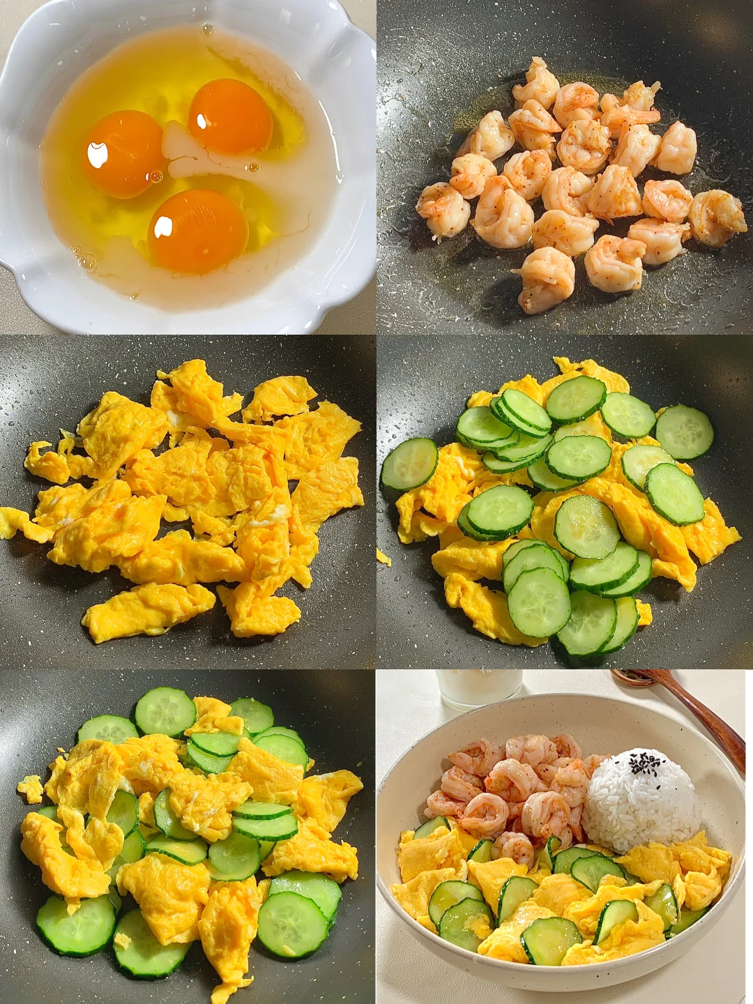 今日减脂餐黄瓜滑鸡蛋!巨鲜美😋 📝食材:虾仁、黄瓜、鸡蛋、一拳头米饭 ✨步骤: 1️⃣碗里打入3个鸡蛋+1勺淀粉水搅拌均匀 2️⃣起锅喷油把虾仁炒熟+黑胡椒盐调味 3️⃣起锅烧油鸡蛋滑熟→加入黄瓜片炒熟→加盐和鸡精调味即可出锅啦✅ 🍃装盘开吃啦[色色R] 自律餐也可以好吃到光盘💯低卡高蛋白的搭配 这一口下去鲜美的巨满足[亲一个R]