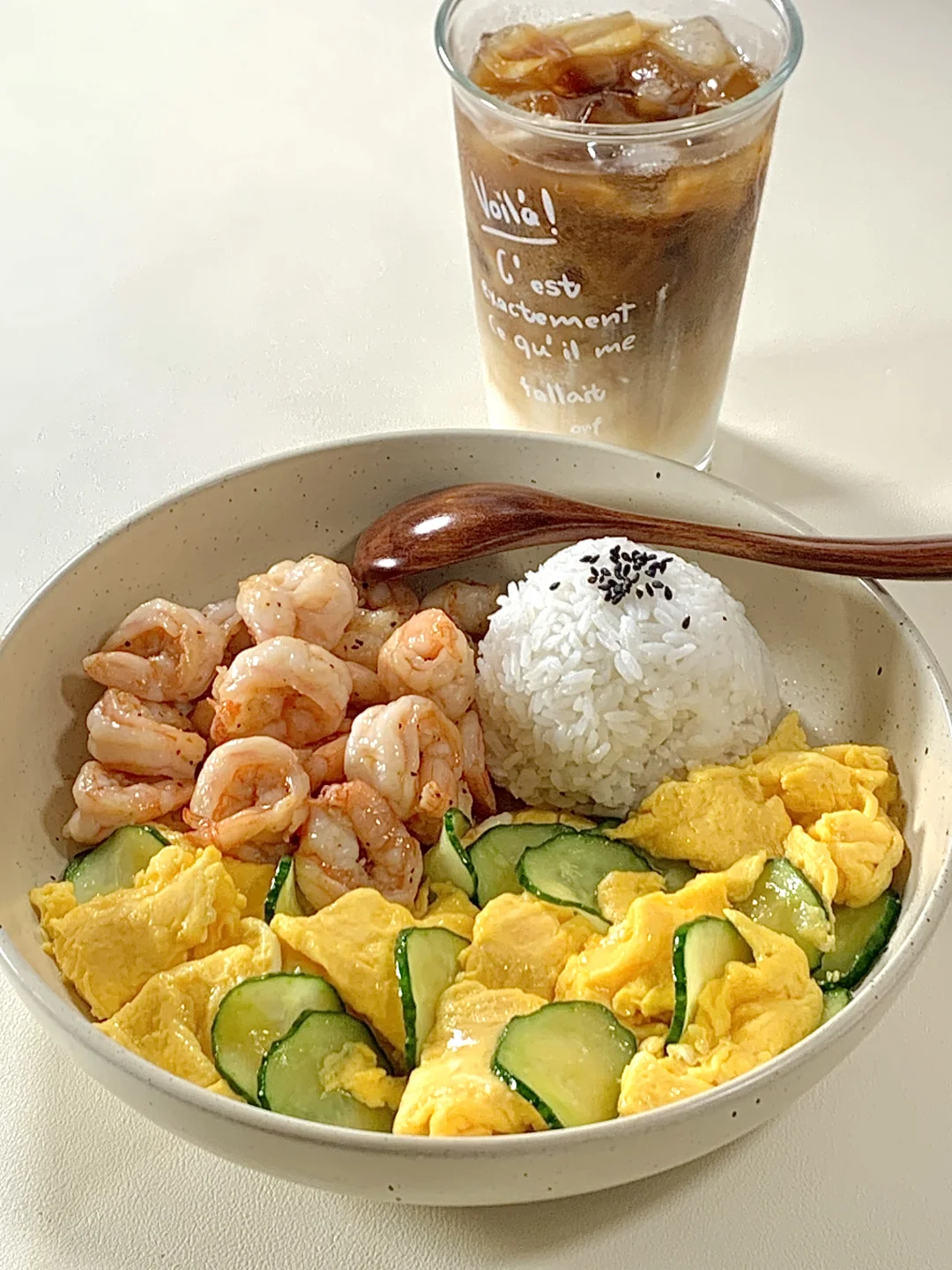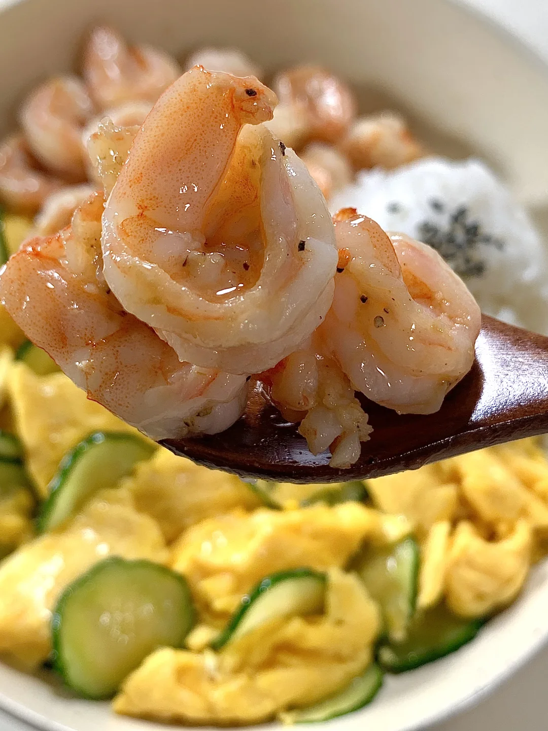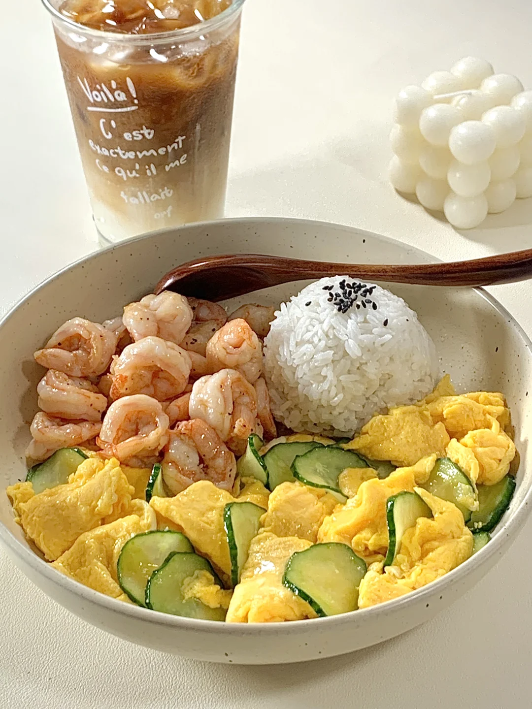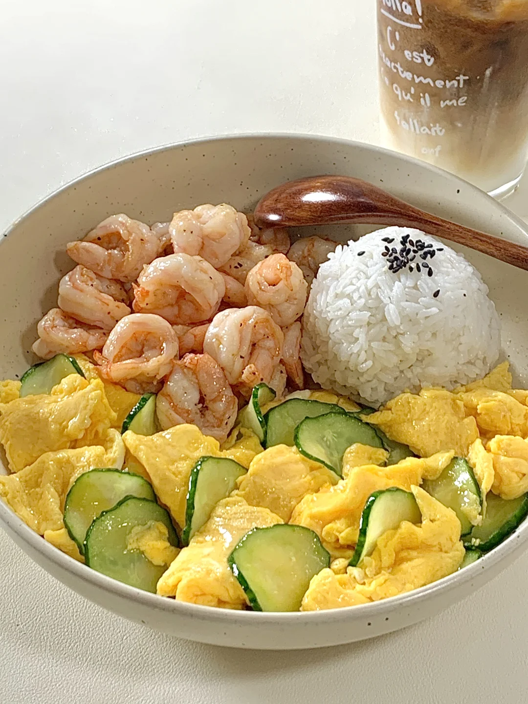 今日减脂餐黄瓜滑鸡蛋!巨鲜美😋 📝食材:虾仁、黄瓜、鸡蛋、一拳头米饭 ✨步骤: 1️⃣碗里打入3个鸡蛋+1勺淀粉水搅拌均匀 2️⃣起锅喷油把虾仁炒熟+黑胡椒盐调味 3️⃣起锅烧油鸡蛋滑熟→加入黄瓜片炒熟→加盐和鸡精调味即可出锅啦✅ 🍃装盘开吃啦[色色R] 自律餐也可以好吃到光盘💯低卡高蛋白的搭配 这一口下去鲜美的巨满足[亲一个R]