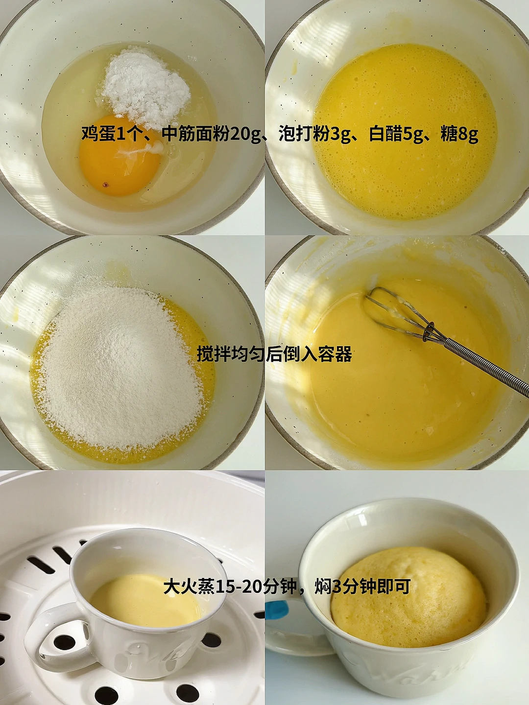 食材:鸡蛋1个、中筋面粉20g、泡打粉3g、白醋5g、糖8g(可不加)